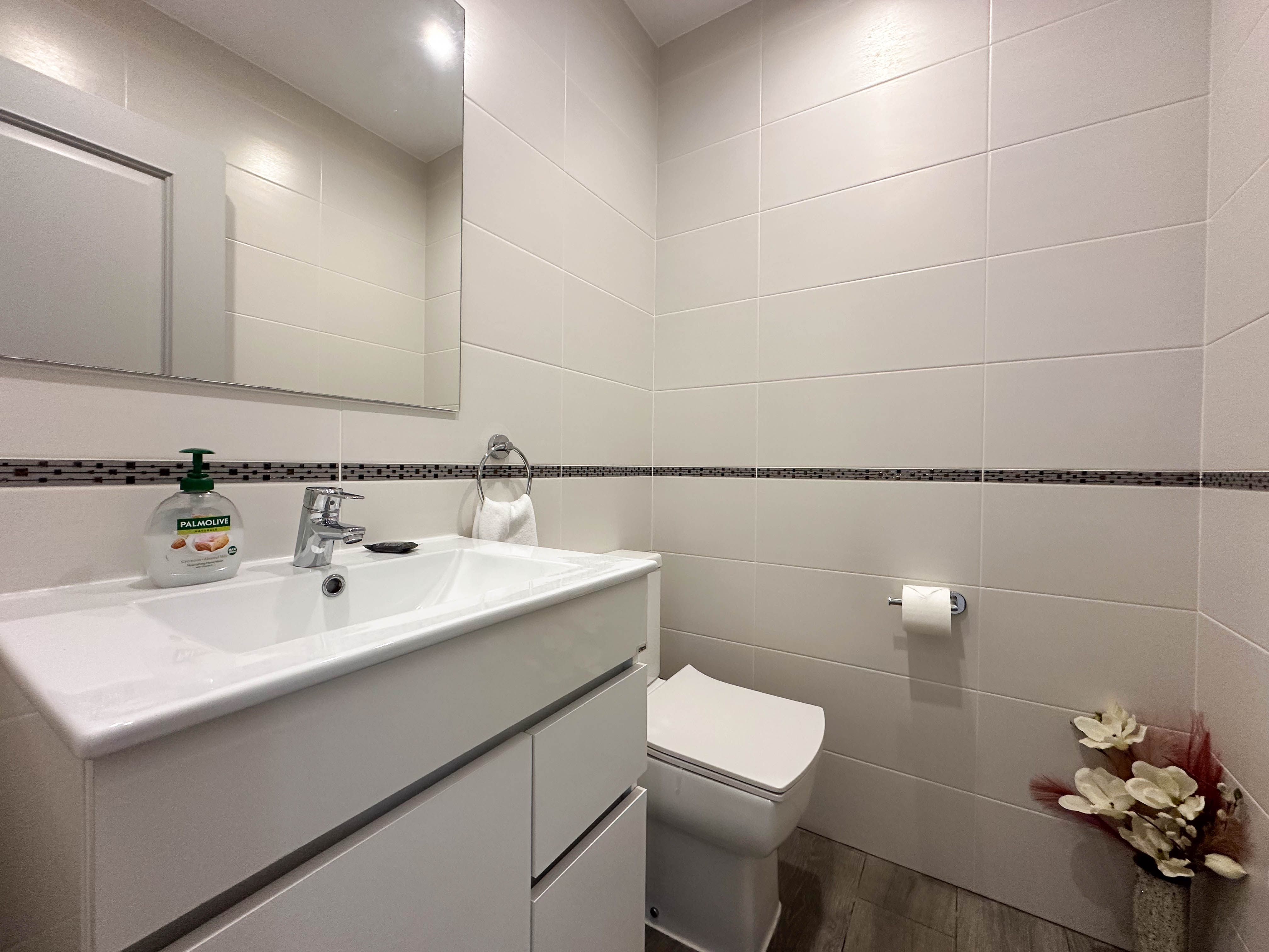 The living room is large, has 2 sofas, air conditioning and cable TV with HD channels and High Speed Fiber Internet. It has sliding windows that lead onto the outdoor area, where you can find a table and chairs for meals, a BBQ and the pool that has sun loungers. Also on the ground floor, you will find a small guest bathroom. The washing machine is in the garage.