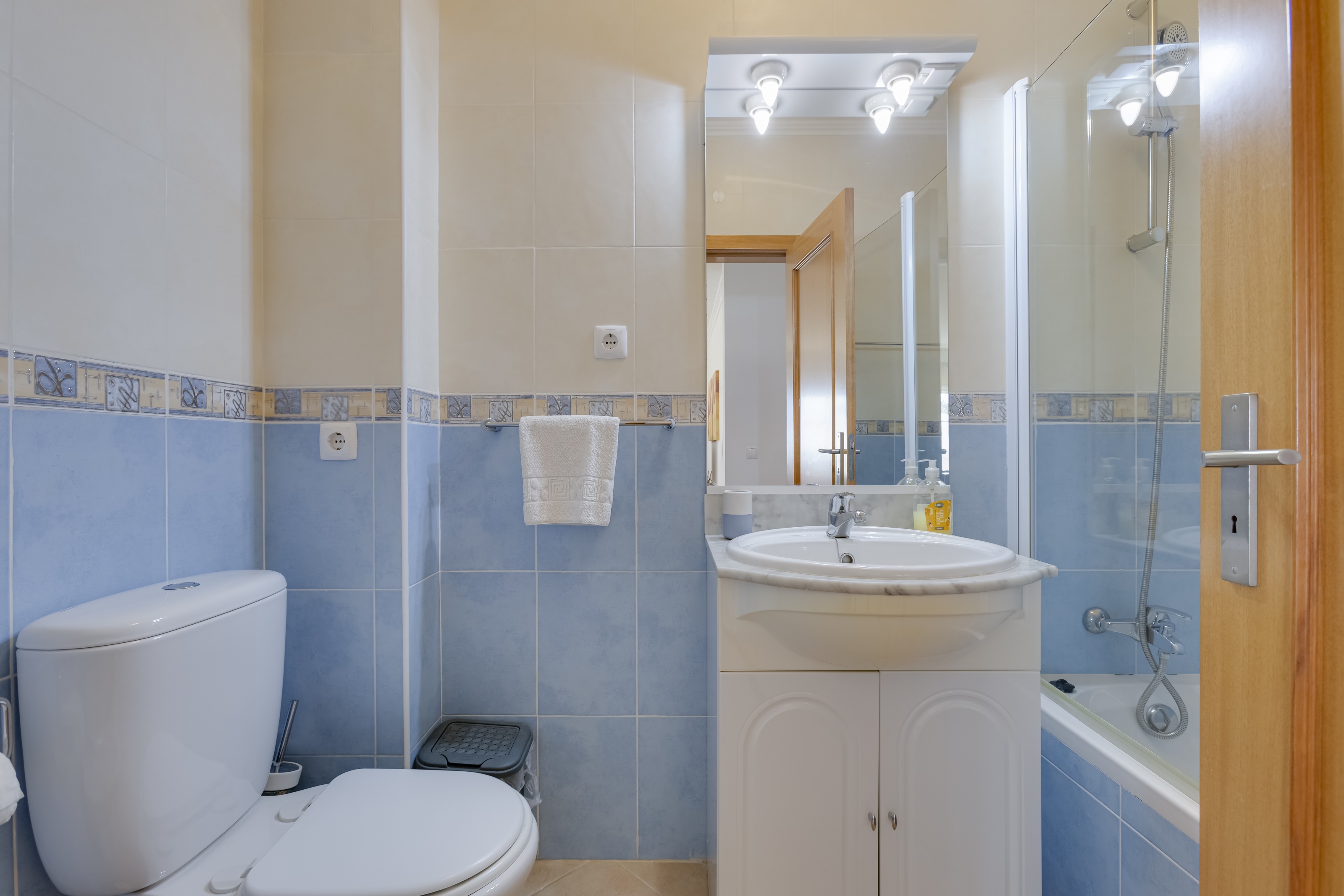 The main bedroom has a double bed, a balcony and an en-suite bathroom with shower. The other bedroom has 2 single beds. Both bedrooms have built-in wardrobes and air conditioning. Between both bedrooms is the 2nd bathroom with a bathtub.