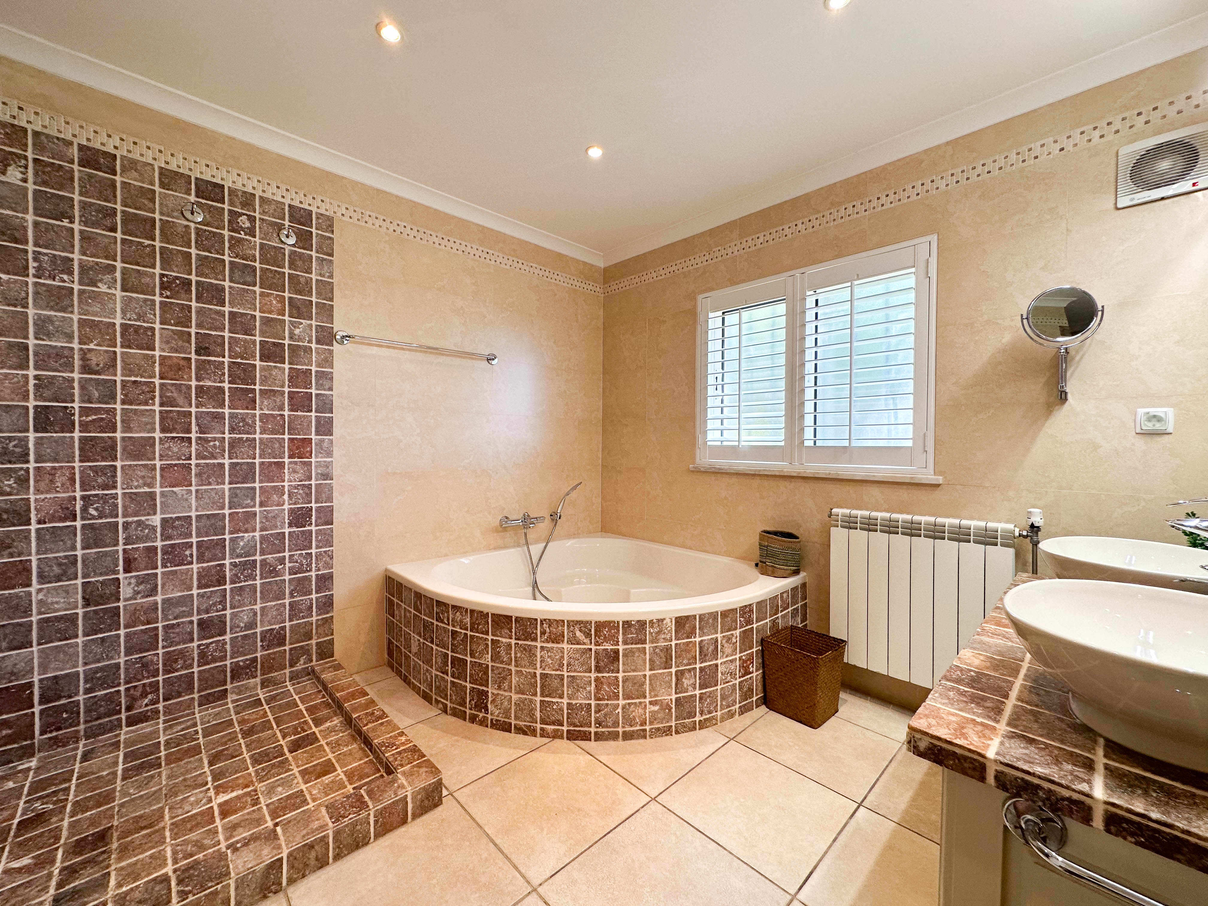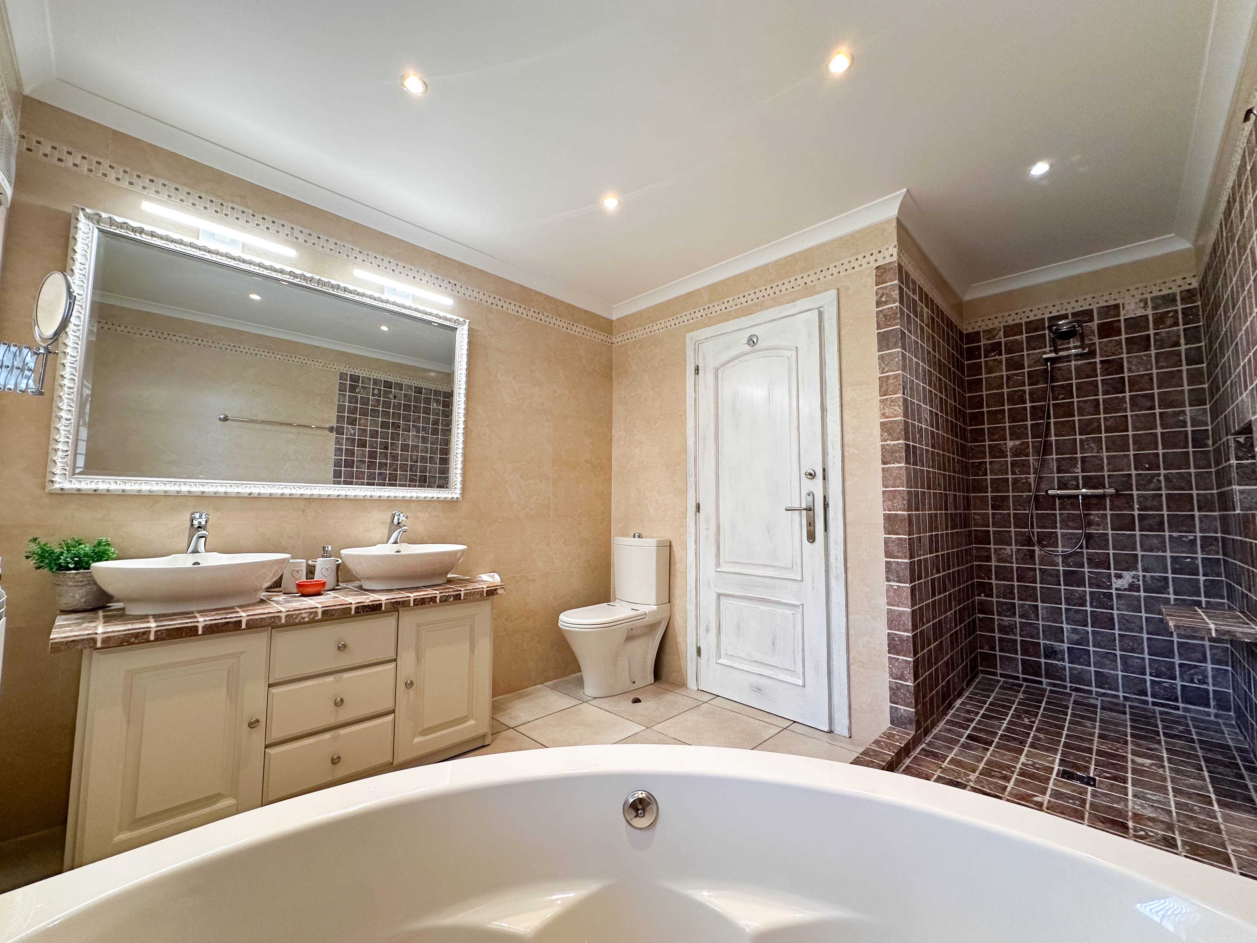 This great 5 bedroom villa offers the following accommodation: Master bedroom with king size bed and en-suite bathroom with double sinks and big shower area, and private conservatory with access to the garden.