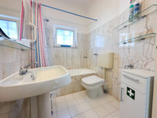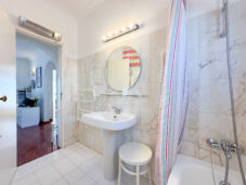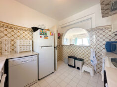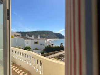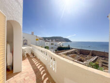 O apartamento fica no primeiro piso, com entrada diretamente do exterior. Este é também o piso superior do bloco, com terraço privado ao nível do telhado com vista de toda a praia e parte da vila. Entra-se para um pequeno hall que dá para a cozinha, e também para a grande sala comum com porta de vidro para uma boa varanda com vista magnífica para as ruínas romanas, a praia e o mar. Tem mesa e cadeiras na zona de jantar na sala, e também na varanda para refeições ao ar livre.
