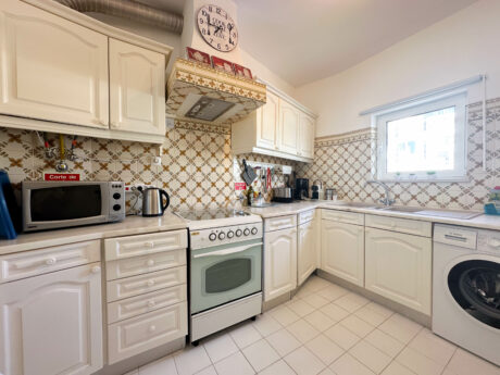 Cozinha com arco passa pratos para a sala, em tons claros com bancada de mármore , totalmente equipada com máquinas de lavar roupa e loiça, frigorífico com congelador separado, microondas, fogão, máquina de café e chaleira.