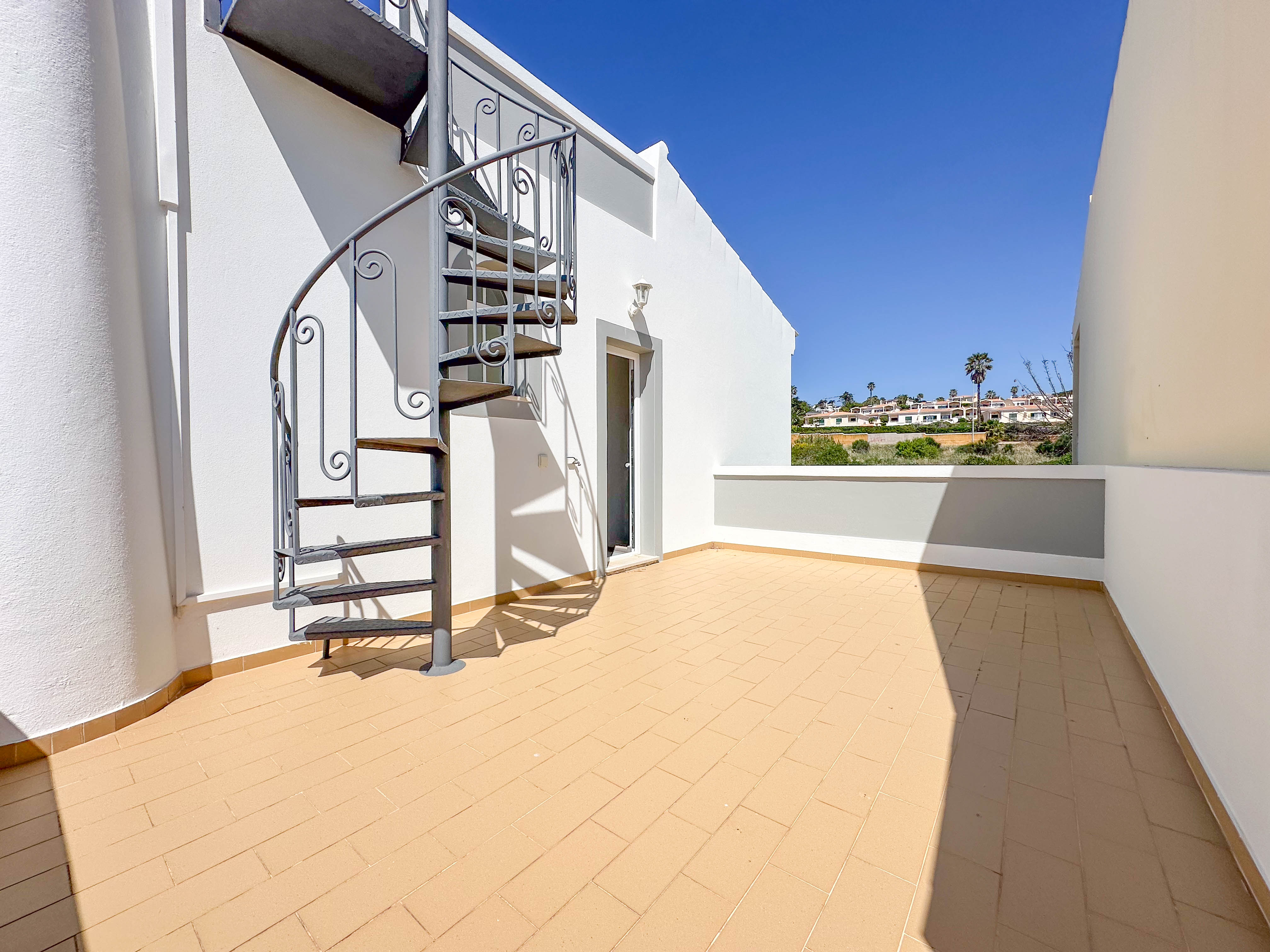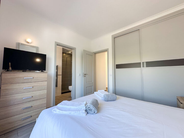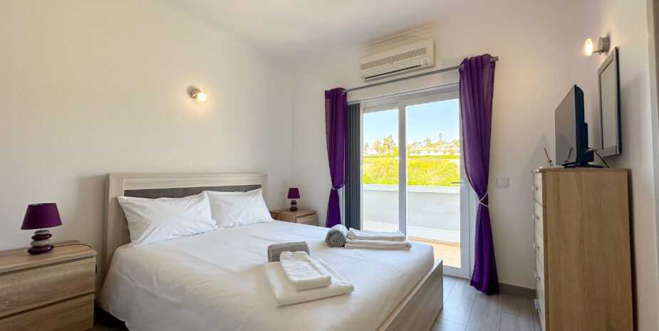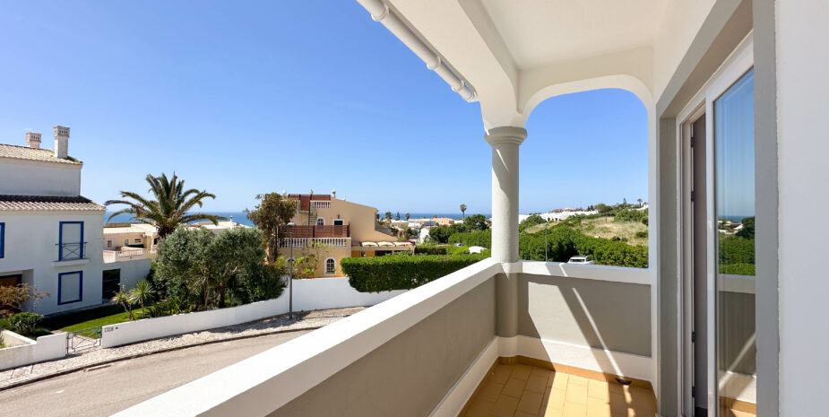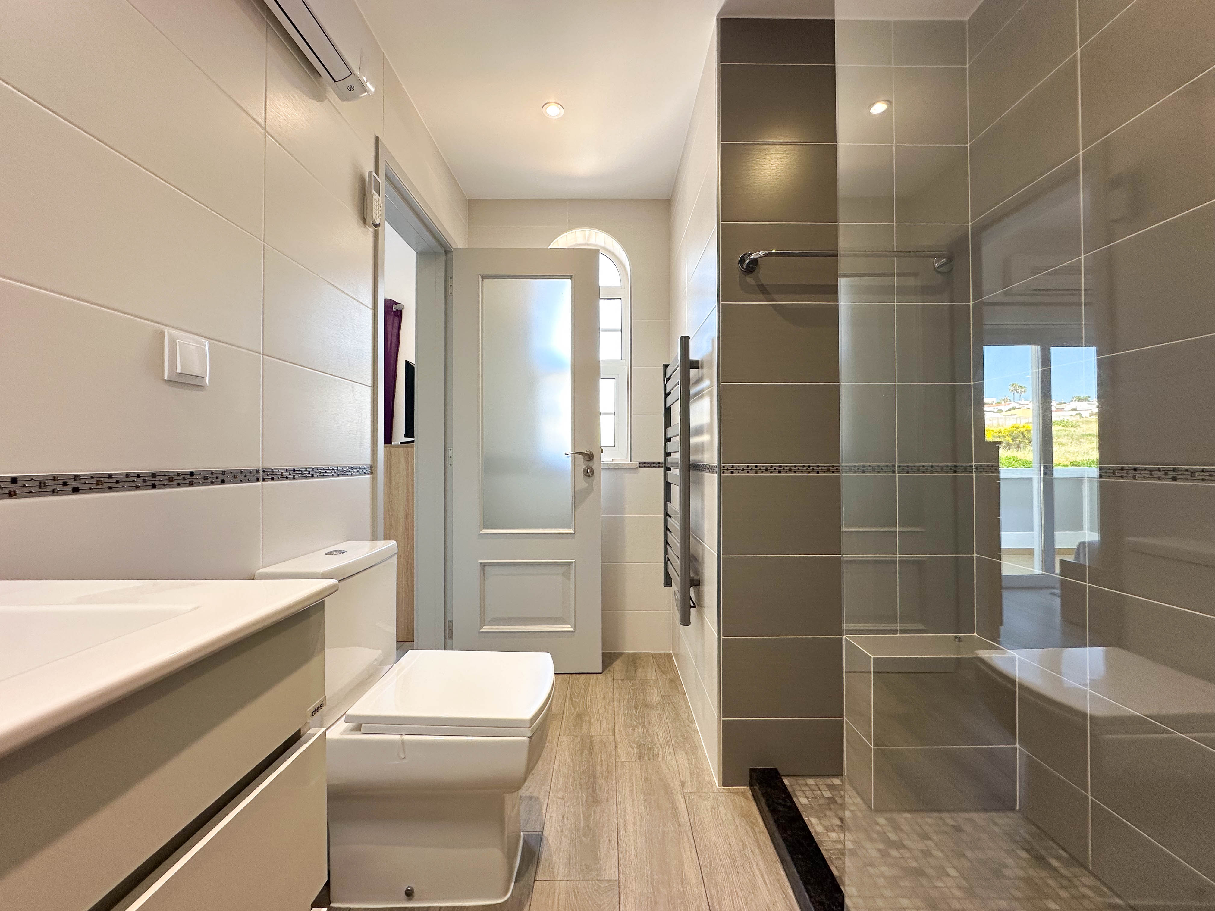 No 1º andar, estão os 3 quartos com camas de casal e ar condicionado. Dois dos quartos tem armários embutidos, e o terceiro tem um armário simples. As duas casas de banho com duche, têm uma decoração muito moderna. Existe também uma varanda grande e acesso ao terraço onde tem uma vista magnifica para o talefo e para o mar.