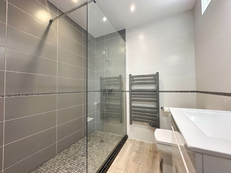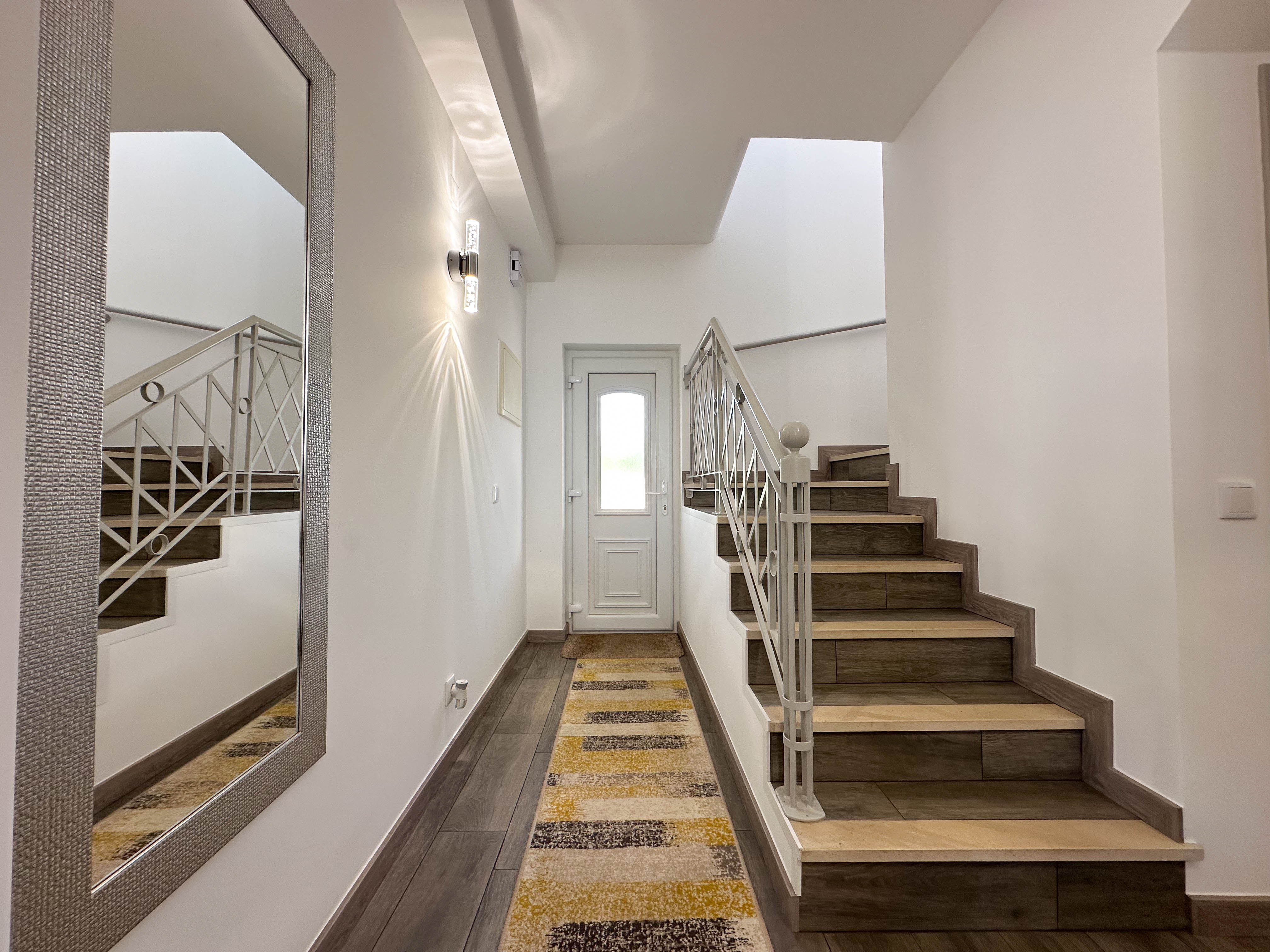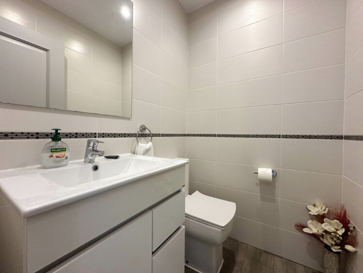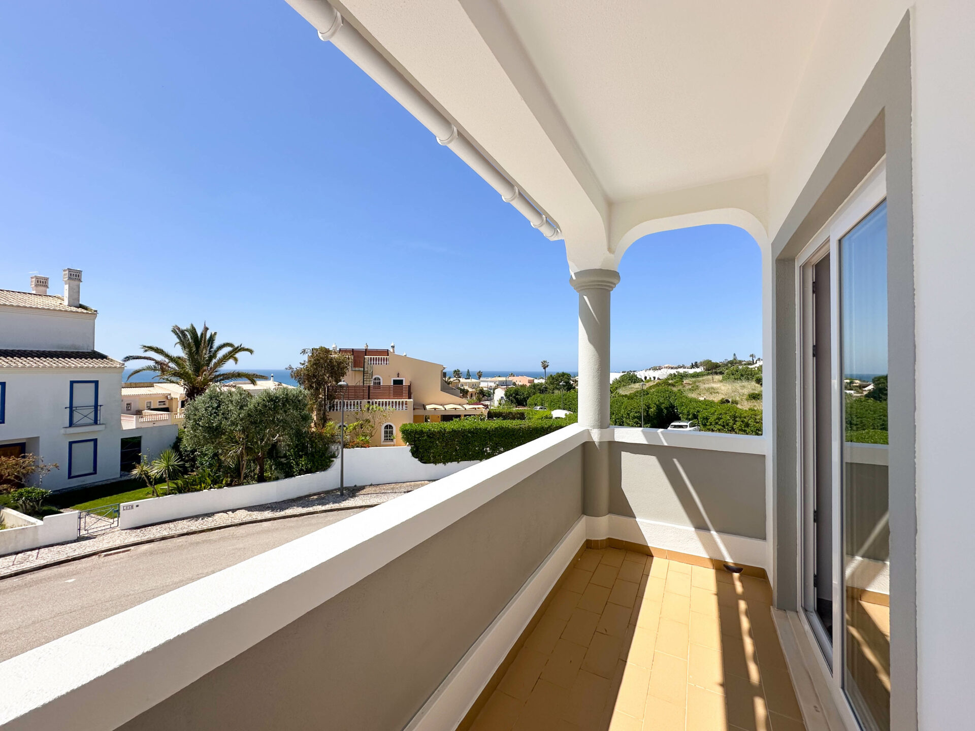 No 1º andar, estão os 3 quartos com camas de casal e ar condicionado. Dois dos quartos tem armários embutidos, e o terceiro tem um armário simples. As duas casas de banho com duche, têm uma decoração muito moderna. Existe também uma varanda grande e acesso ao terraço onde tem uma vista magnifica para o talefo e para o mar.