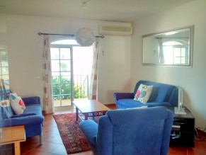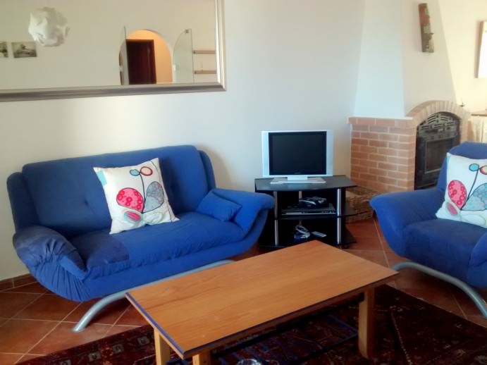 A sala é ampla, com 2 zonas distintas, uma de refeição e outra com os sofás e televisão com canais de satelite e canais portugueses. Tem ar condicionado e lareira.