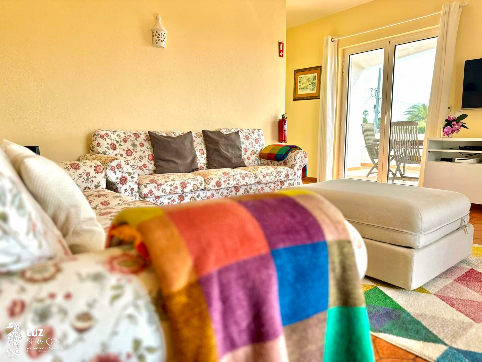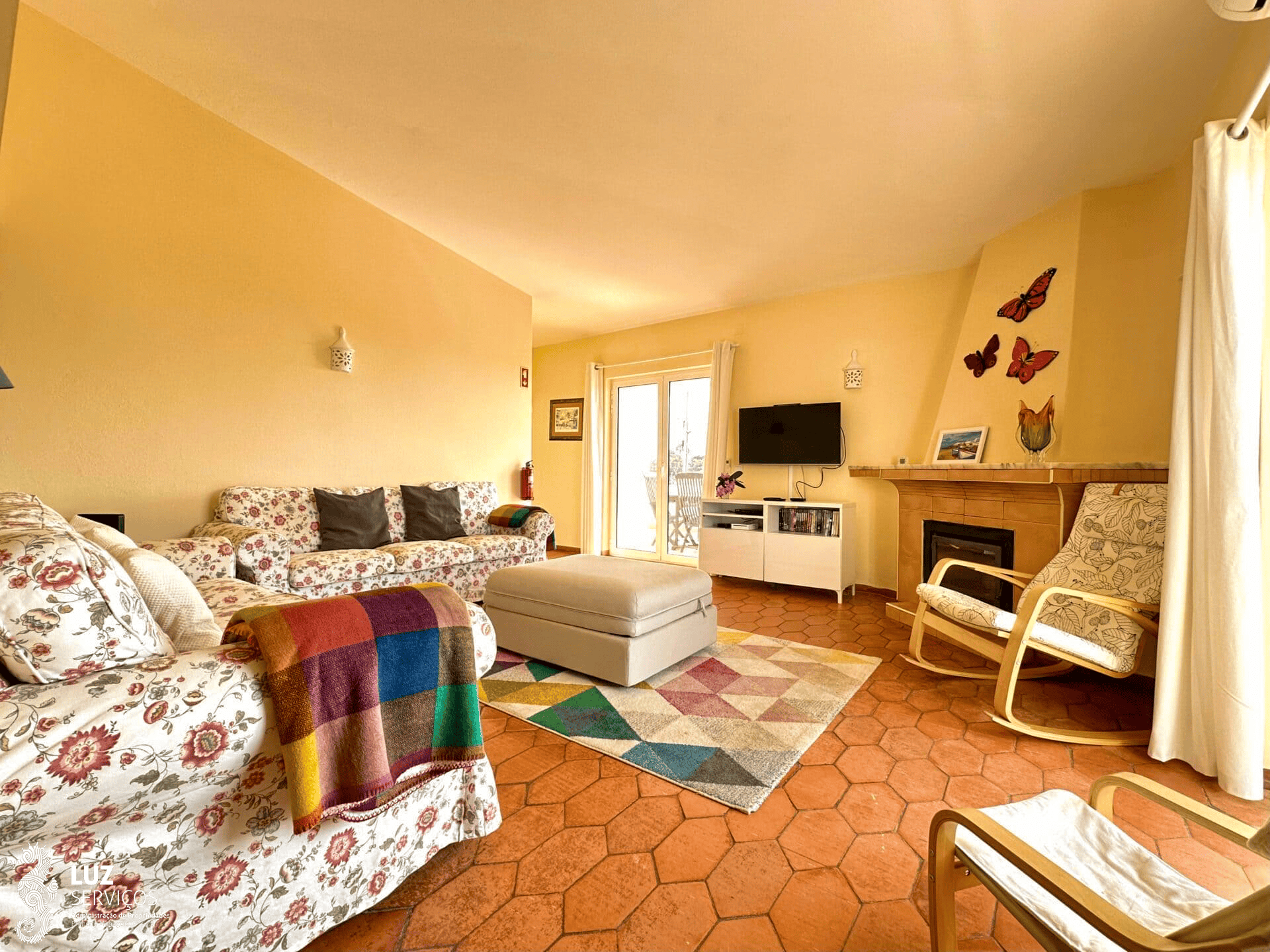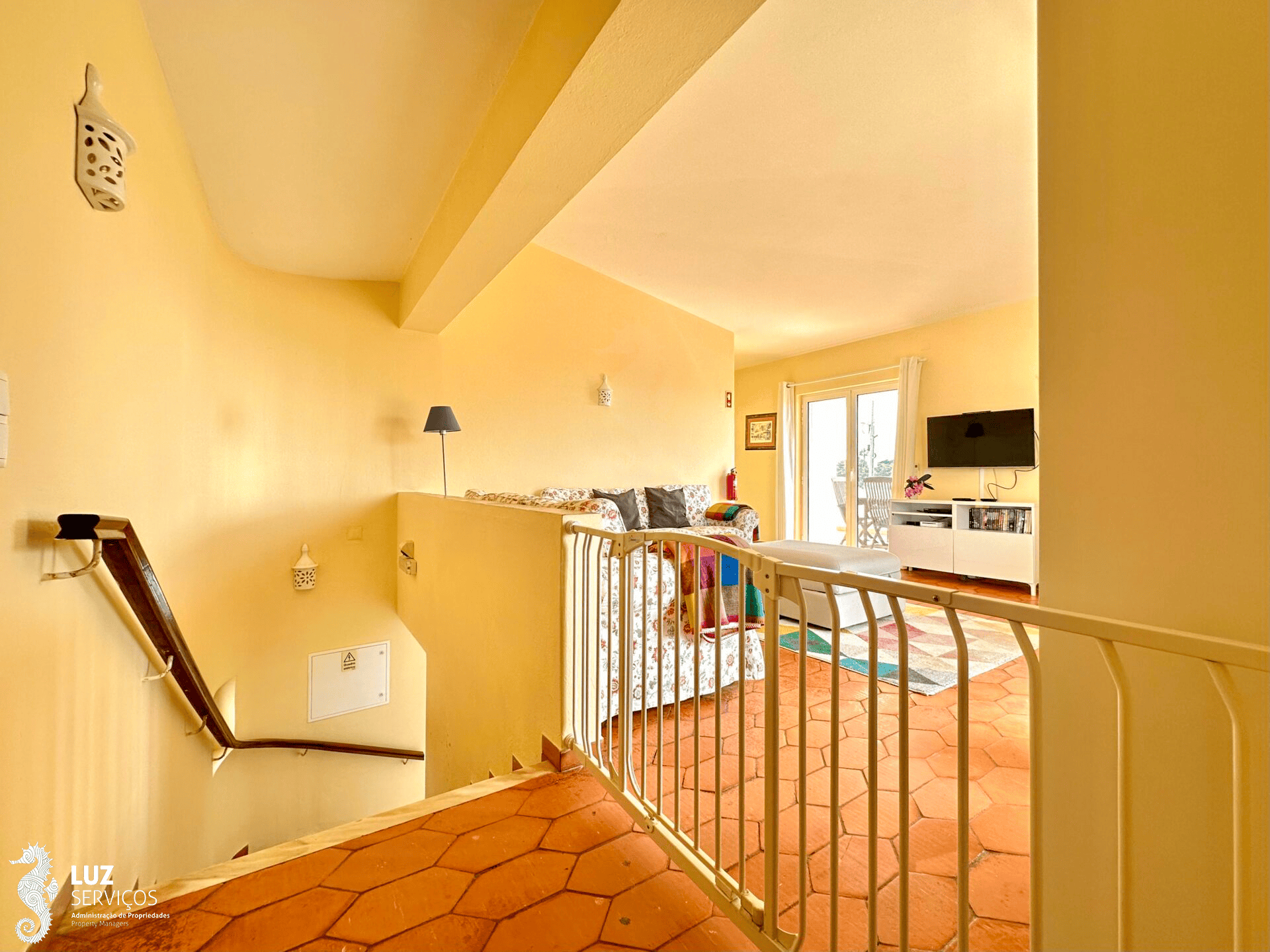 Ao subir as escadas interiores de acesso ao primeiro andar, encontrará uma pequena casa de banho de serviço e ao seu lado esquerdo um portão de segurança para as crianças que dará acesso à sala de estar. A sala de estar é luminosa tem 2 sofás, ar condicionado, lareira, com Televisão MEO e Internet com Wifi, e acesso à varanda onde existe uma mesa com cadeiras com uma maravilhosa vista sobre a Praia da Luz.