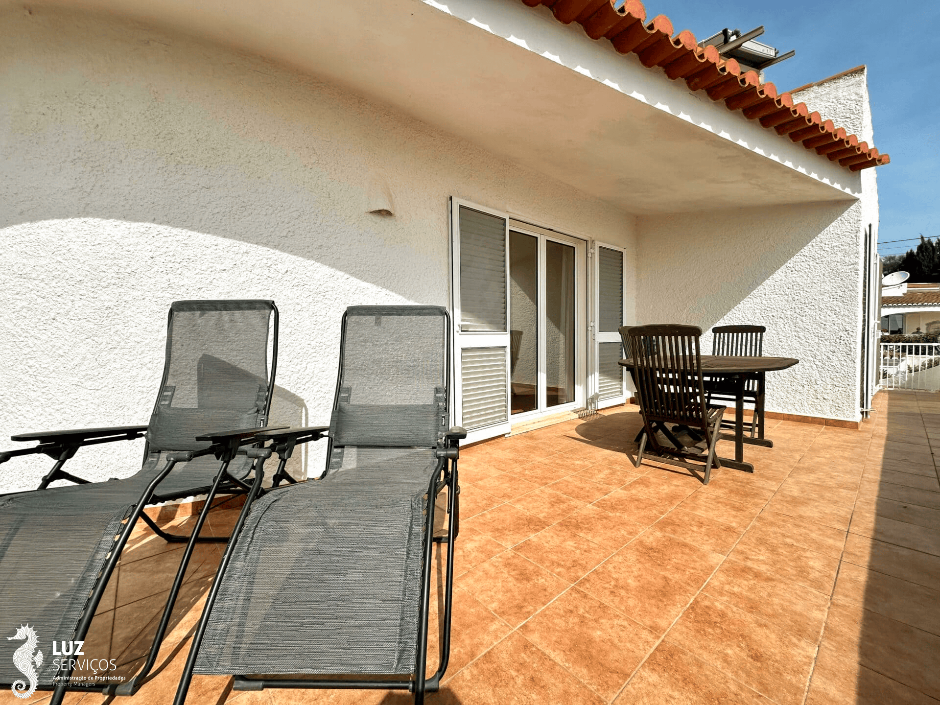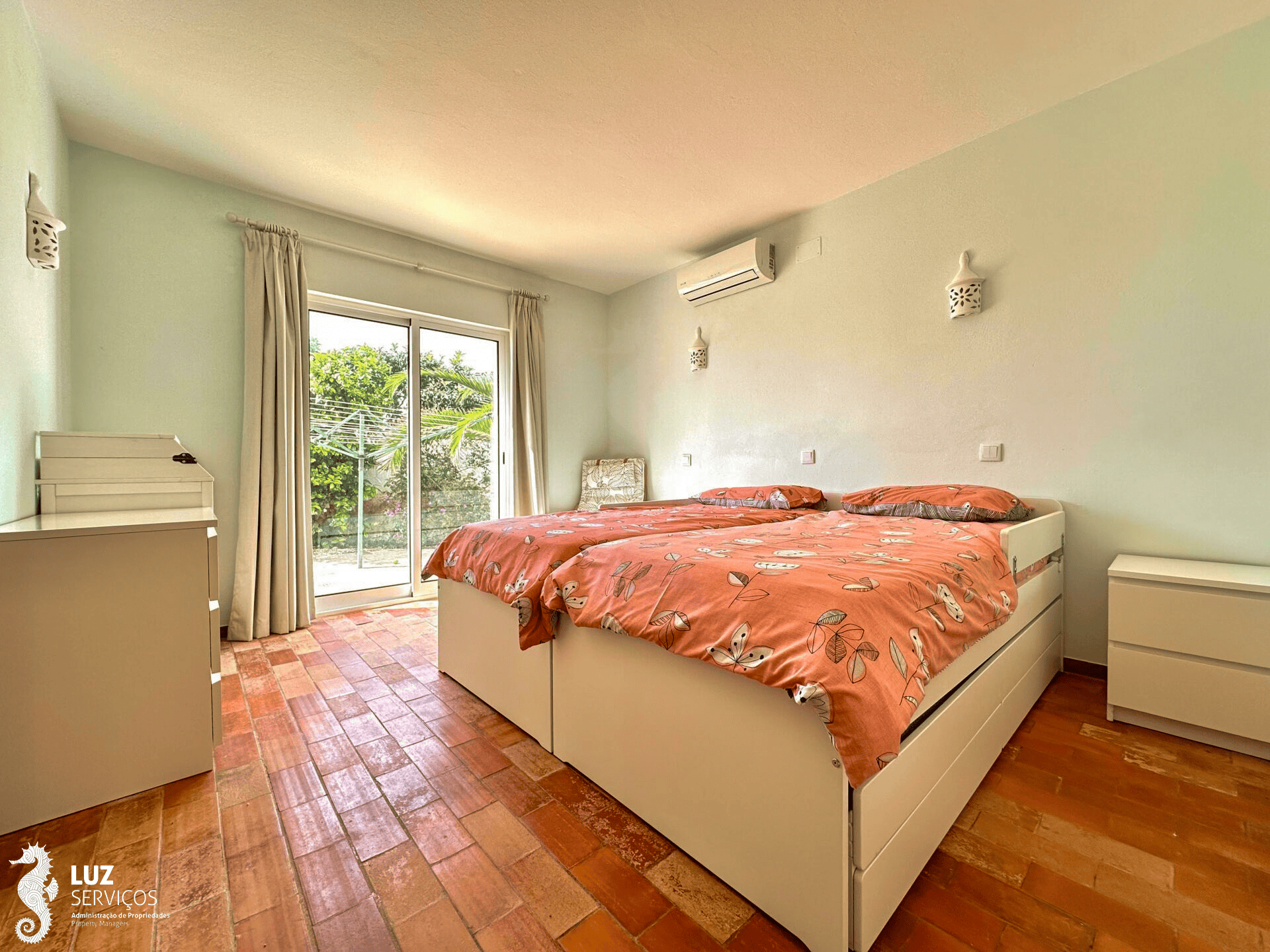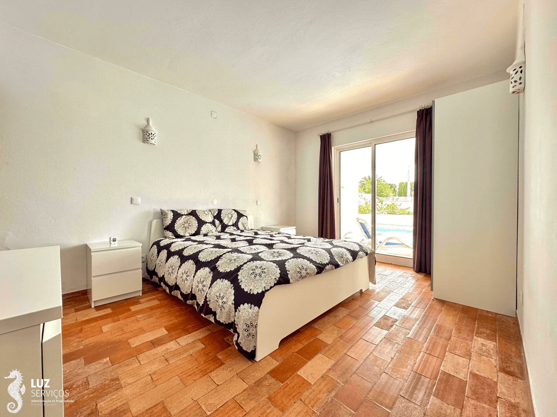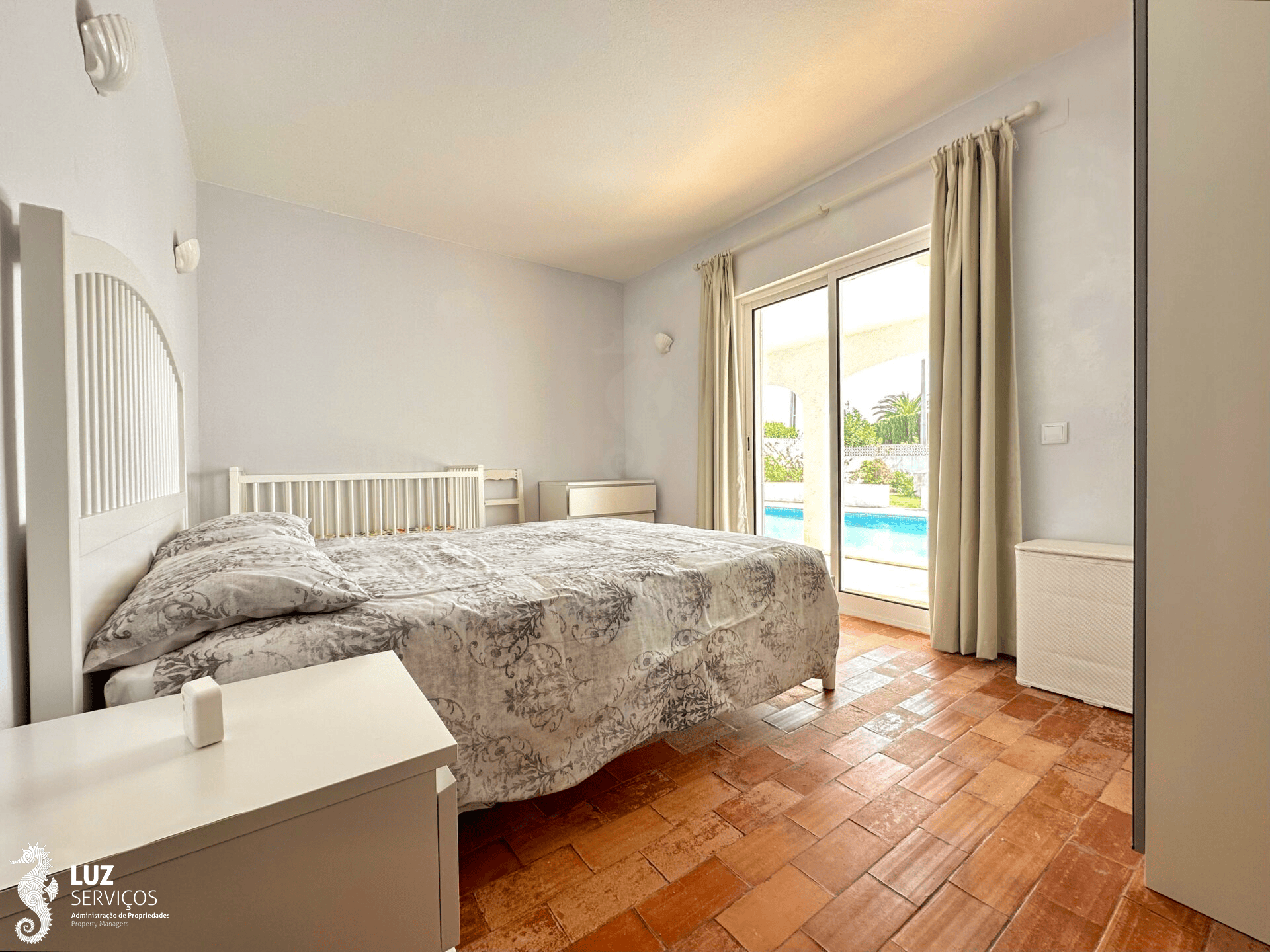 Quando entrar nesta moradia encontra um pequeno hall de entrada que ao virar à sua esquerda desce 3 degraus onde existe um portão de segurança para as crianças e encontrará os quartos. Todos os quartos têm ar condicionado e casa de banho en-suite. Dois deles têm cama de casal e acesso direto para a piscina e o outro quarto tem camas de solteiro e acesso ao terraço.