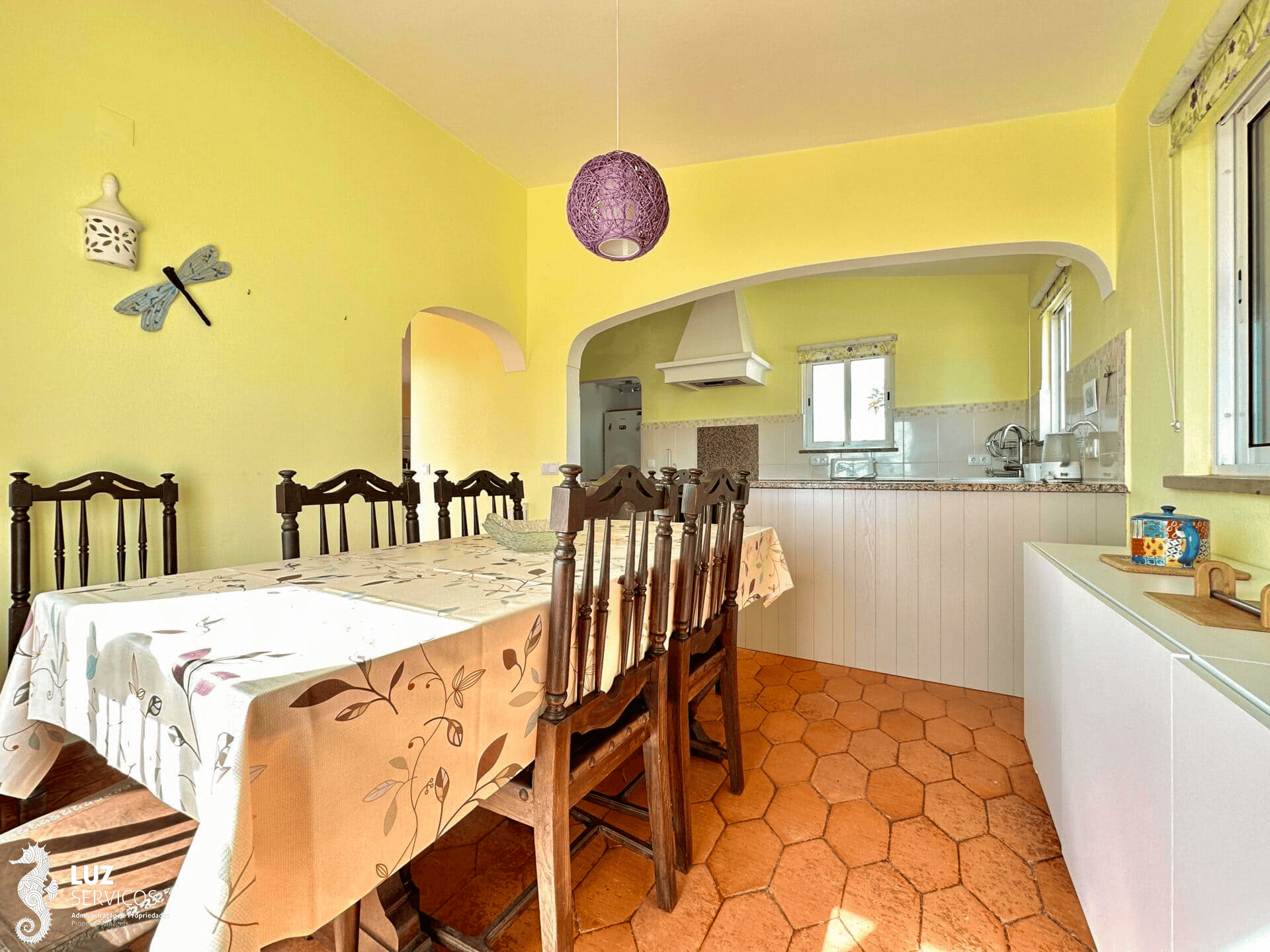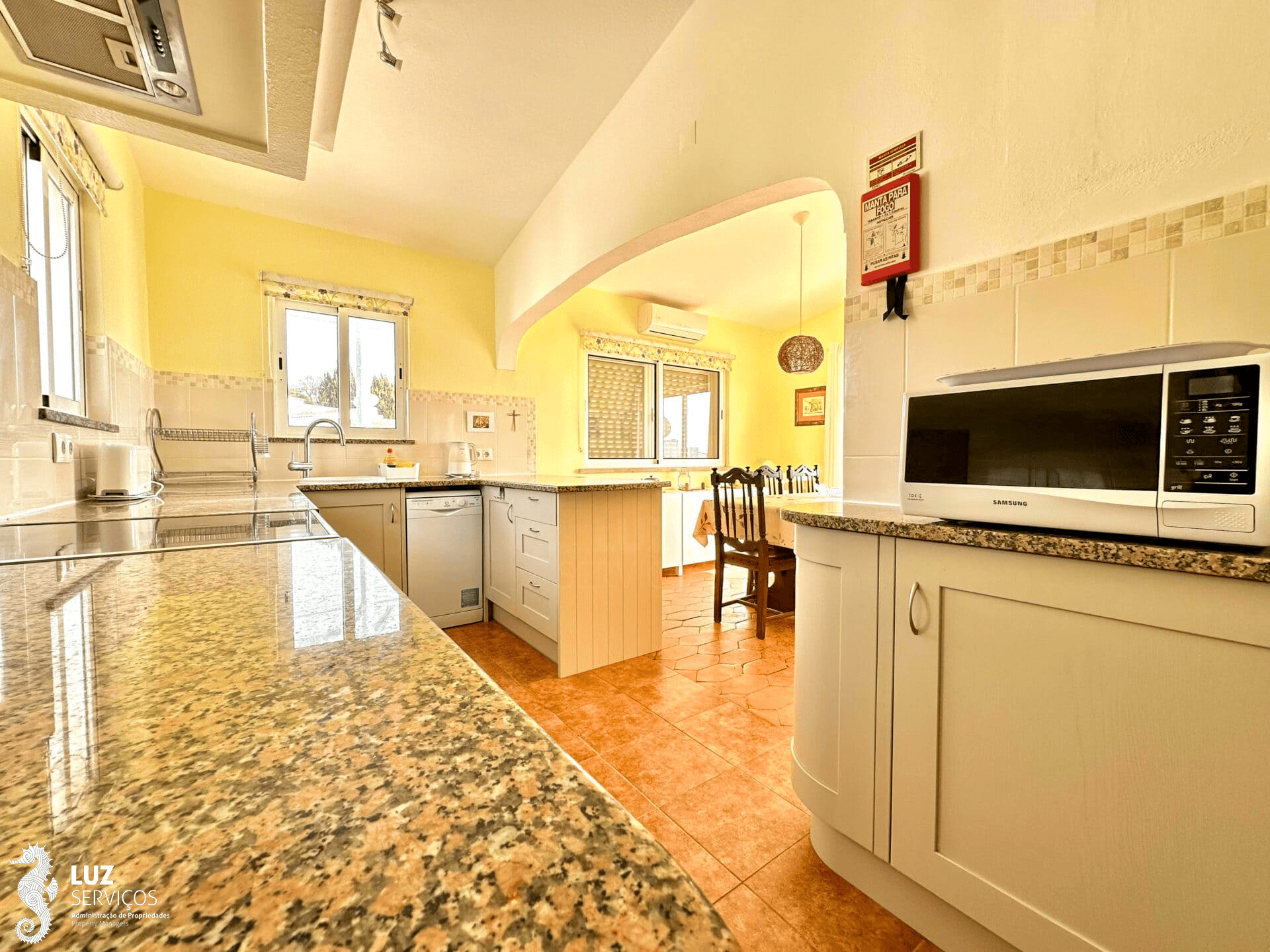 Passando a sala de estar encontrará a cozinha aberta juntamente com a sala de jantar. A cozinha encontra-se totalmente equipada com todos os utensílios para que possa cozinhar as suas refeições. A sala de jantar tem ar condicionado, uma mesa com 8 cadeiras onde poderá usufruir da sua agradável refeição com a família com vista para a Praia da Luz.