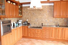 No piso da entrada tem uma grande sala comum de estar e de jantar e grande cozinha aberta, totalmente equipada.  Ambos dão para um pátio exterior coberto, com mobília de exterior, junto à piscina que é rodeada pelo jardim. É um canto muito agradável para refeições ou para descansar.