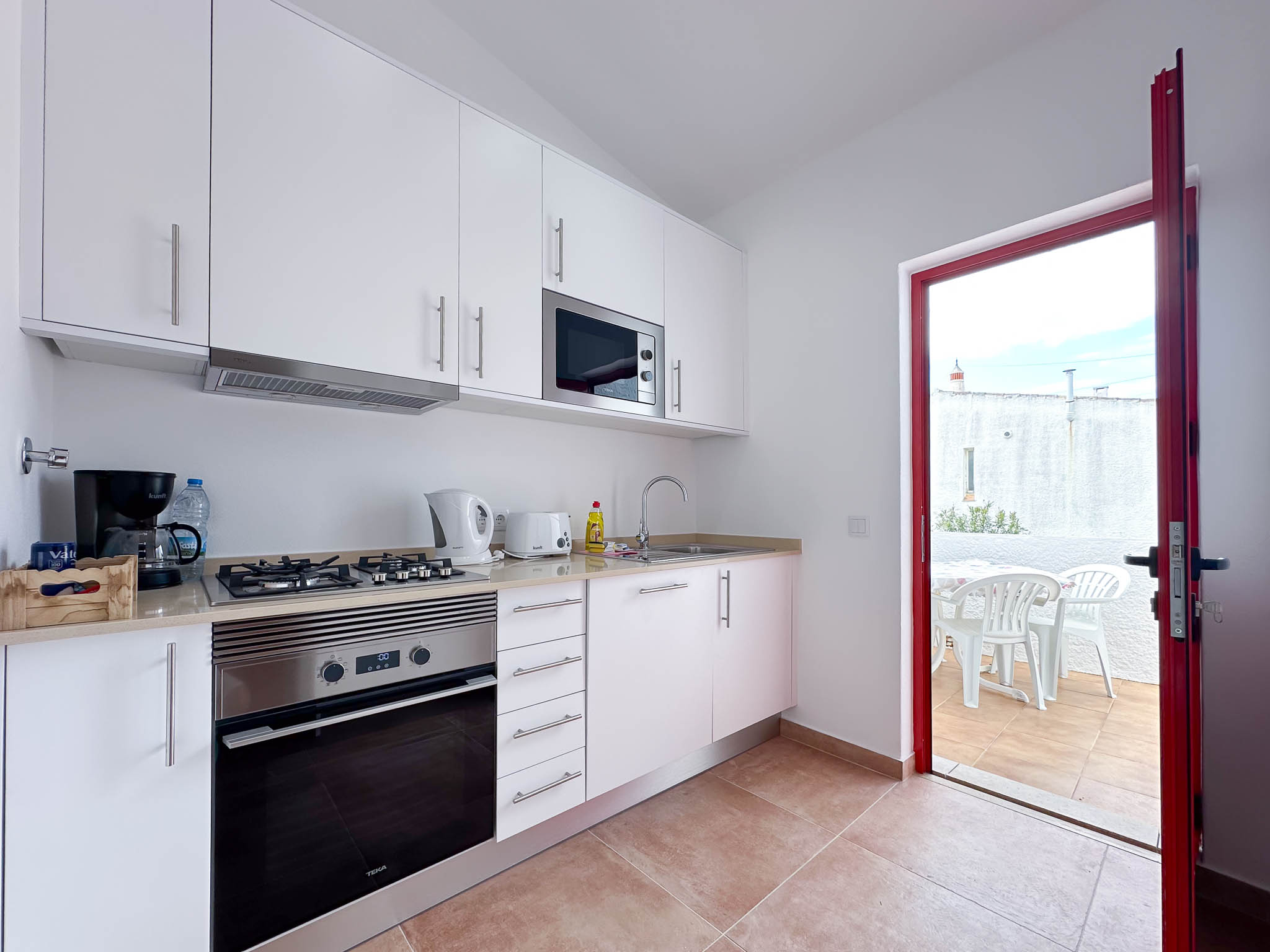 A cozinha foi remodelada recentement e está totalmente equipada com frigorifico, máquina de lavar loiça, chaleira, torradeira, micro-ondas e todos os utensílios necessários para a confeção das suas refeições. A cozinha tem acesso a uma varanda com mesa e cadeiras exteriores.