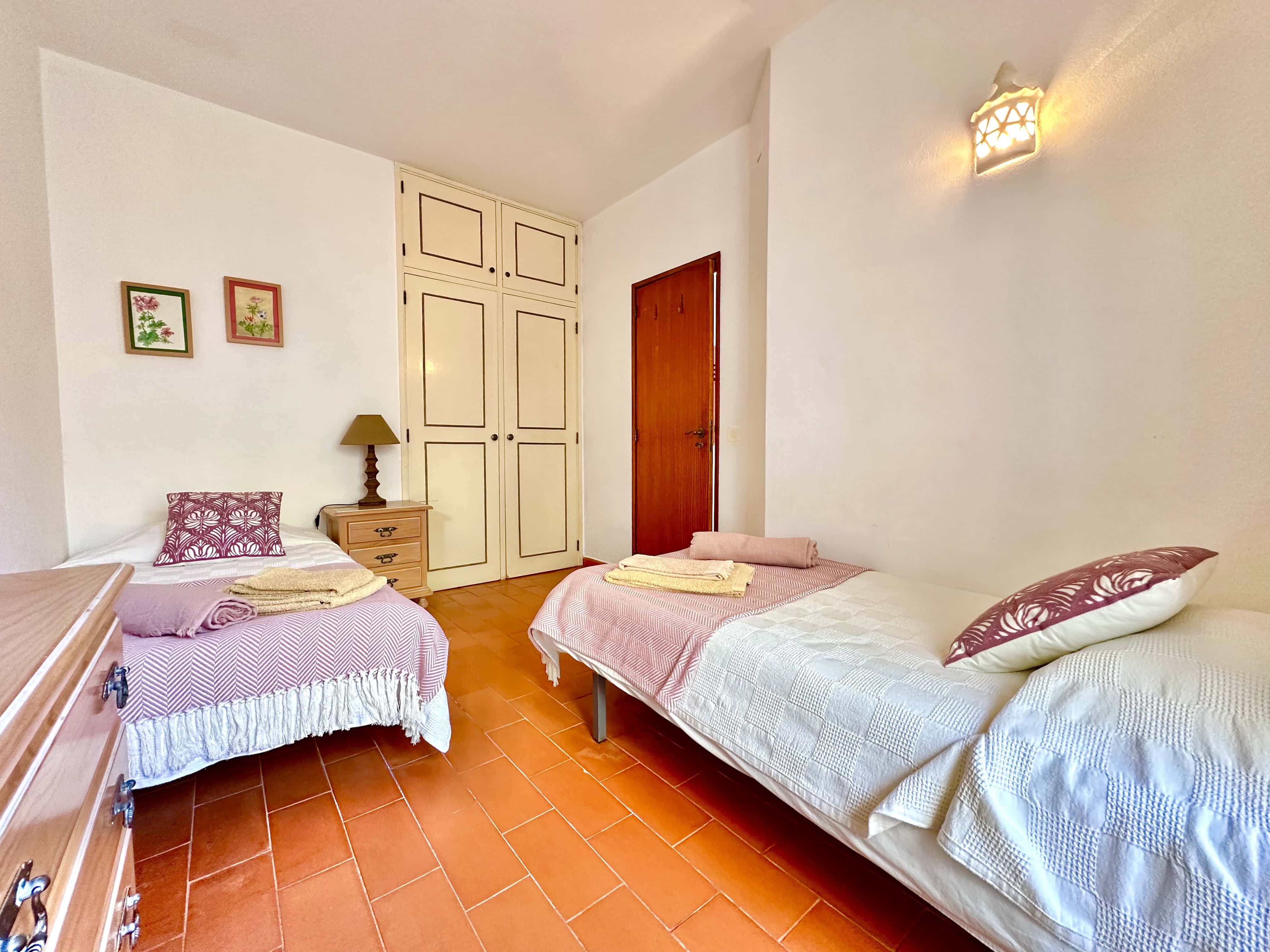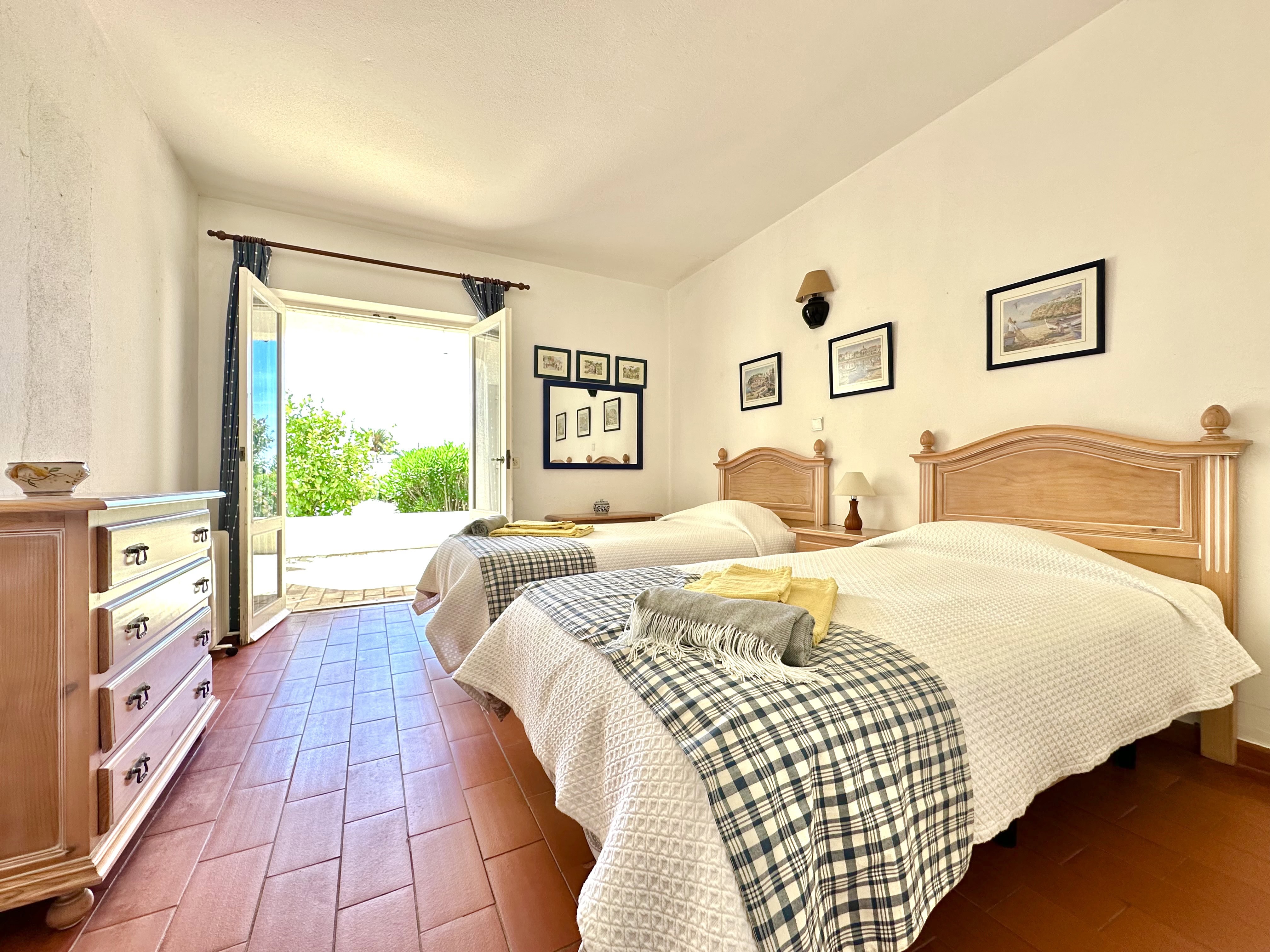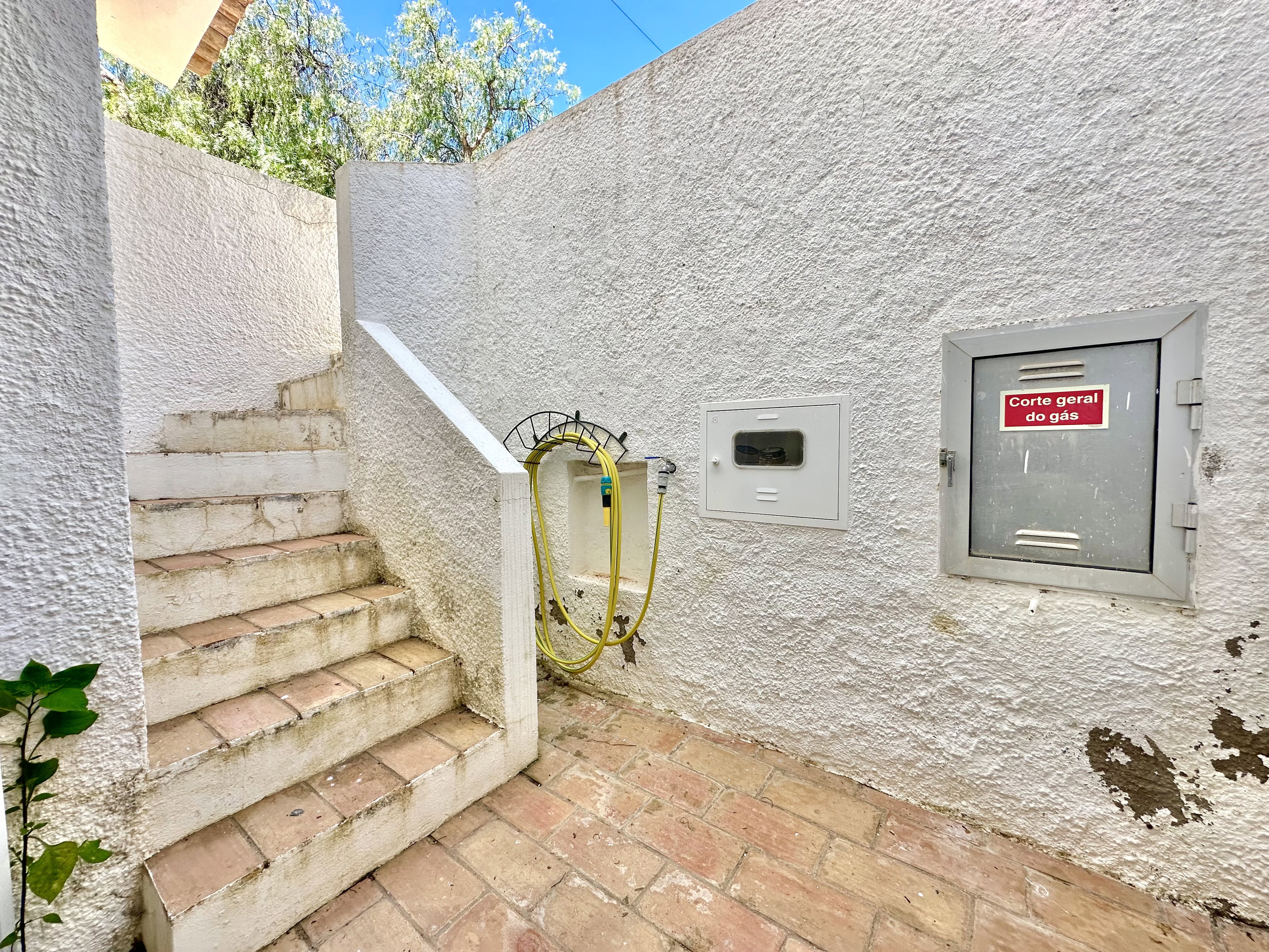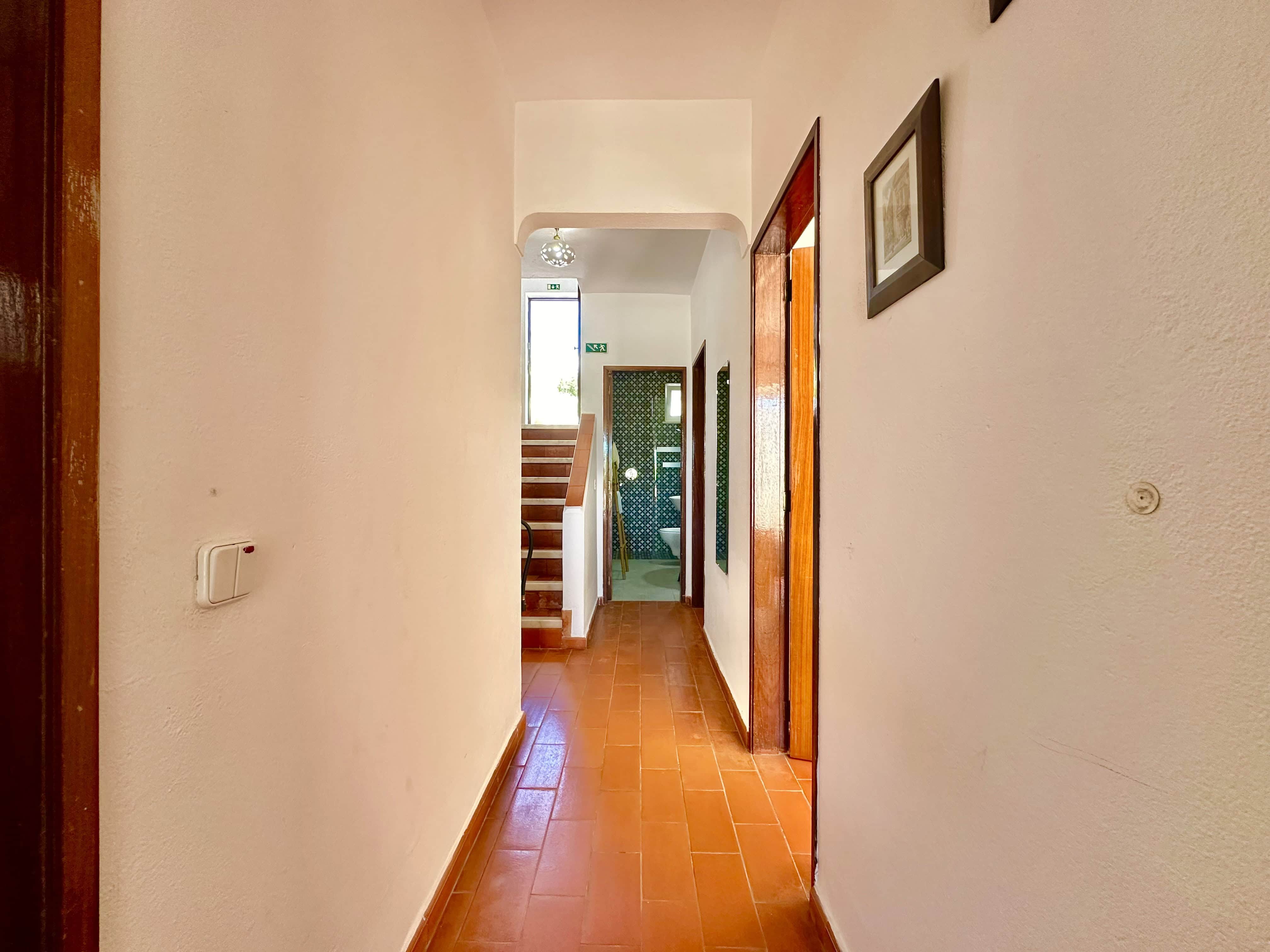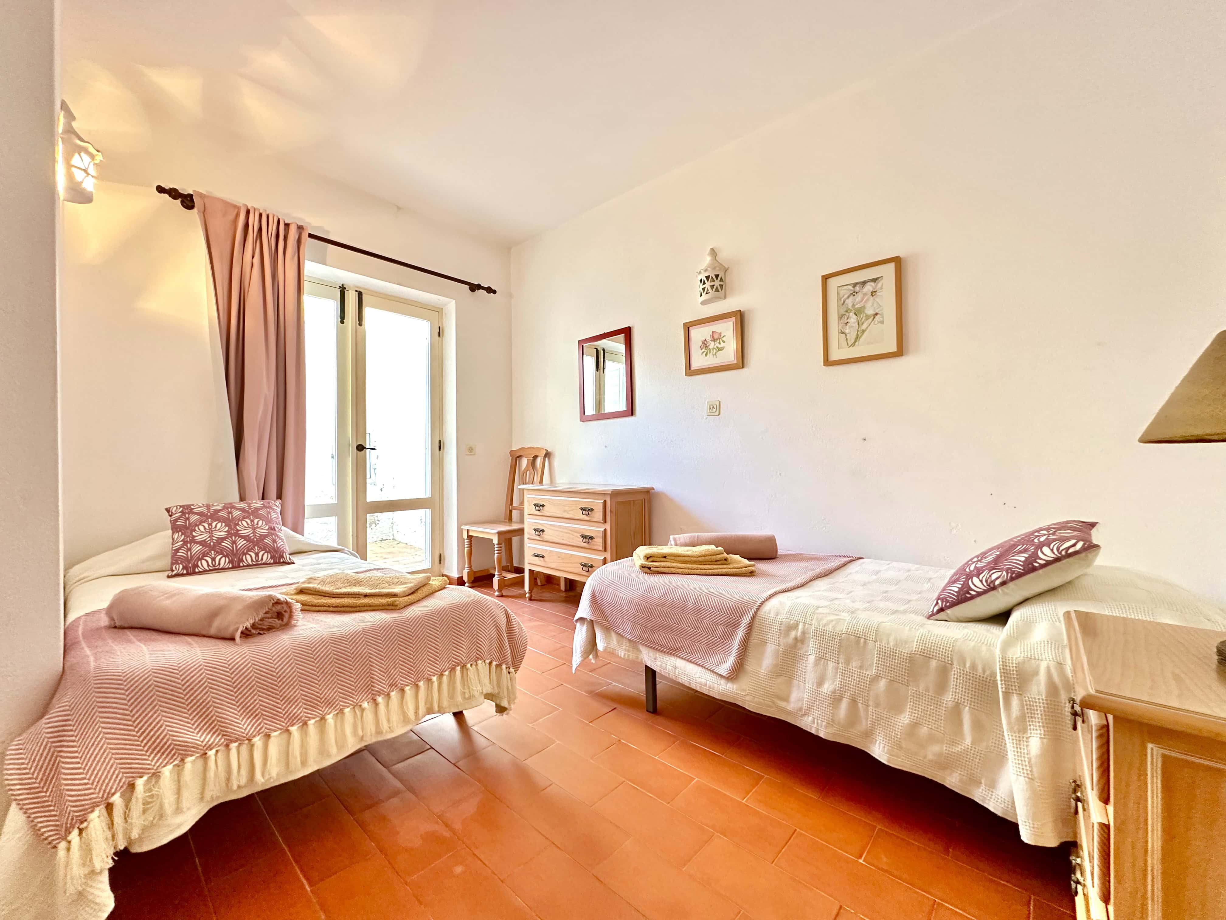 No piso térreo tem 3 quartos, dois são quartos duplos (um dele com ar condicionado) e um tem uma cama de casal, também tem 2 casas de banho com duche. Todos os quartos têm saída para um terraço.