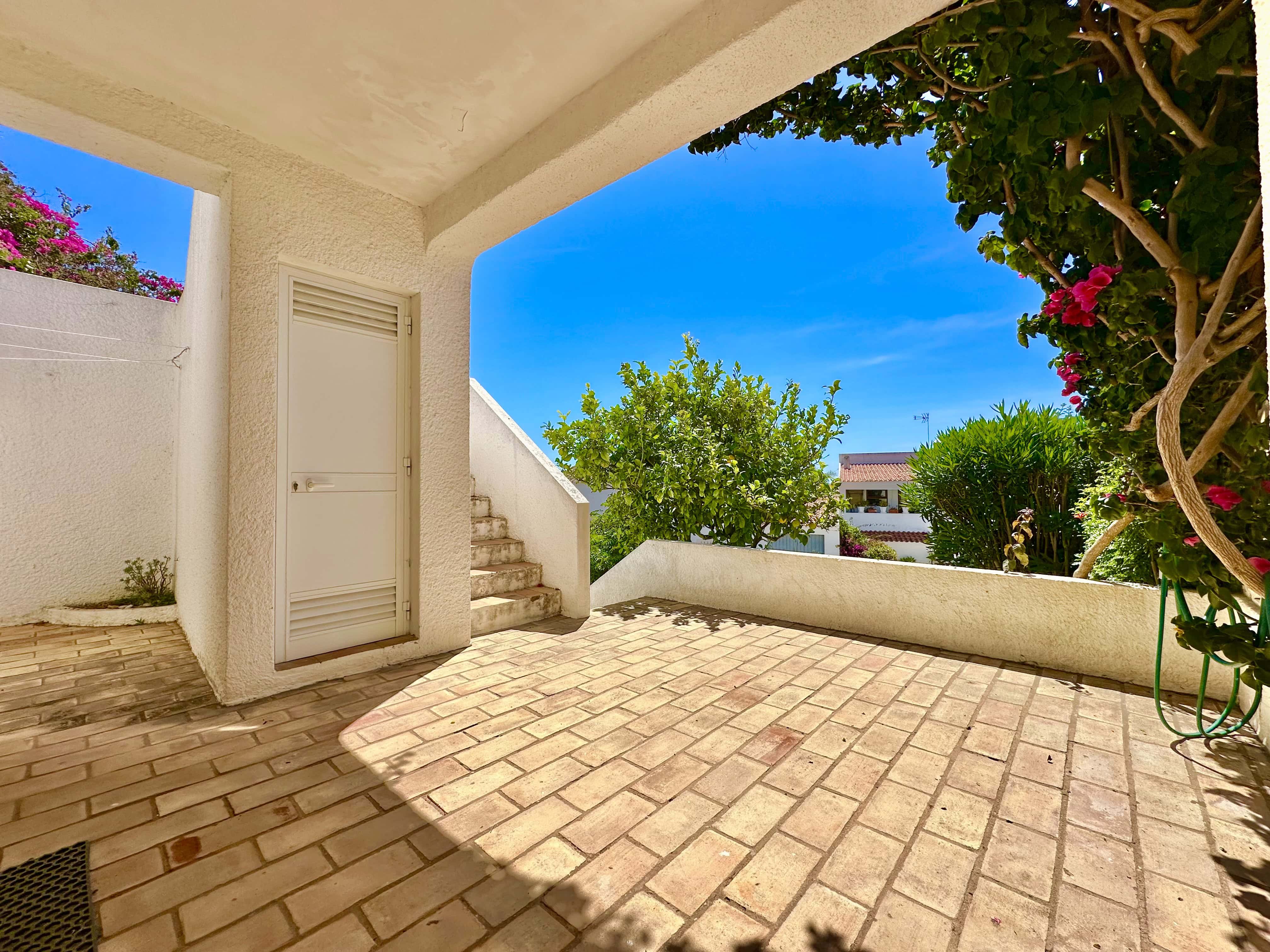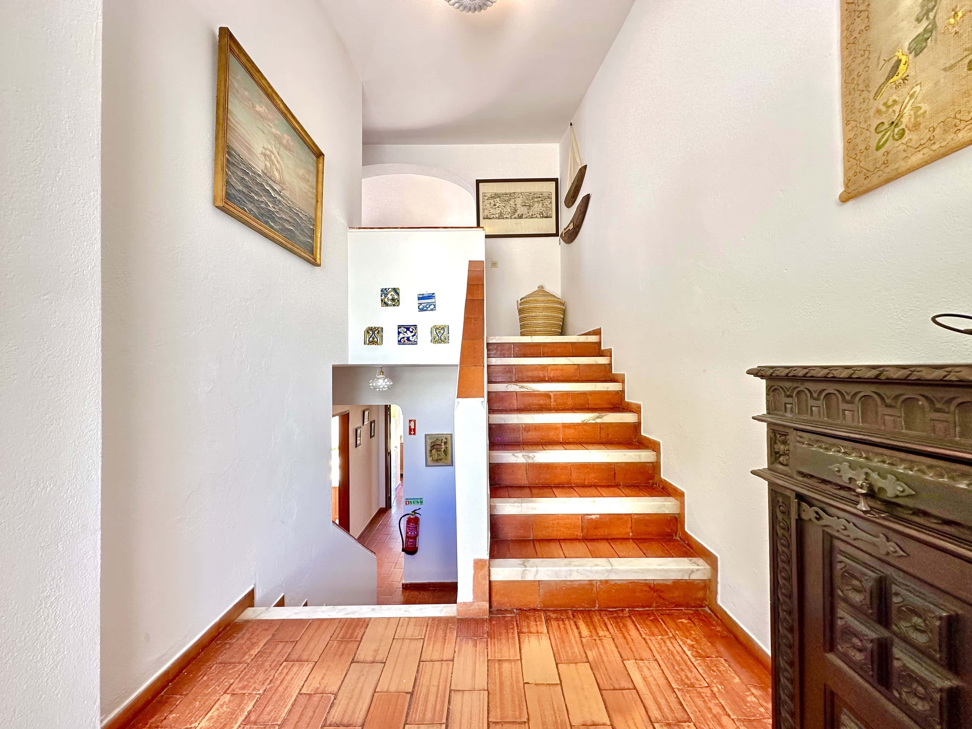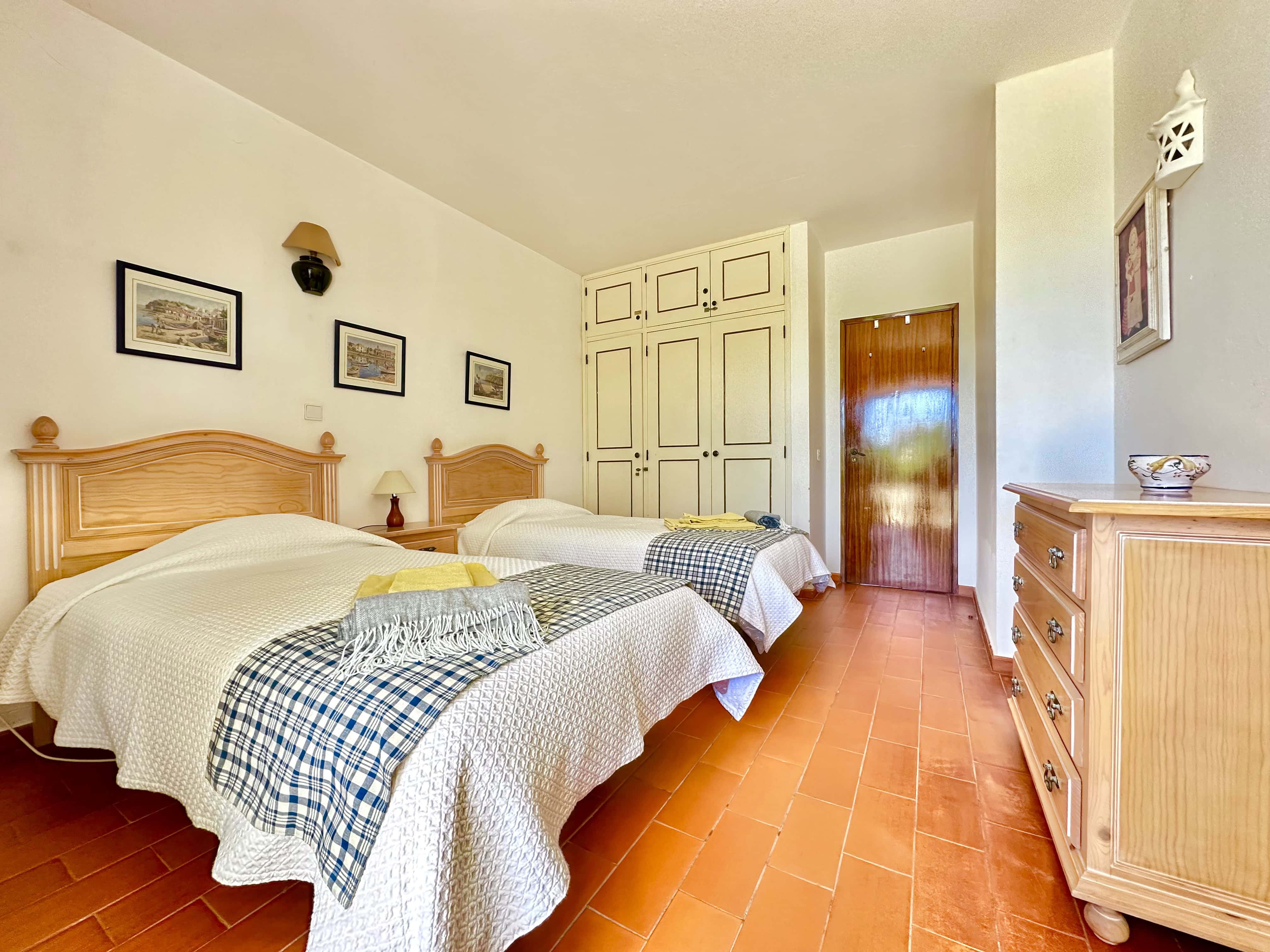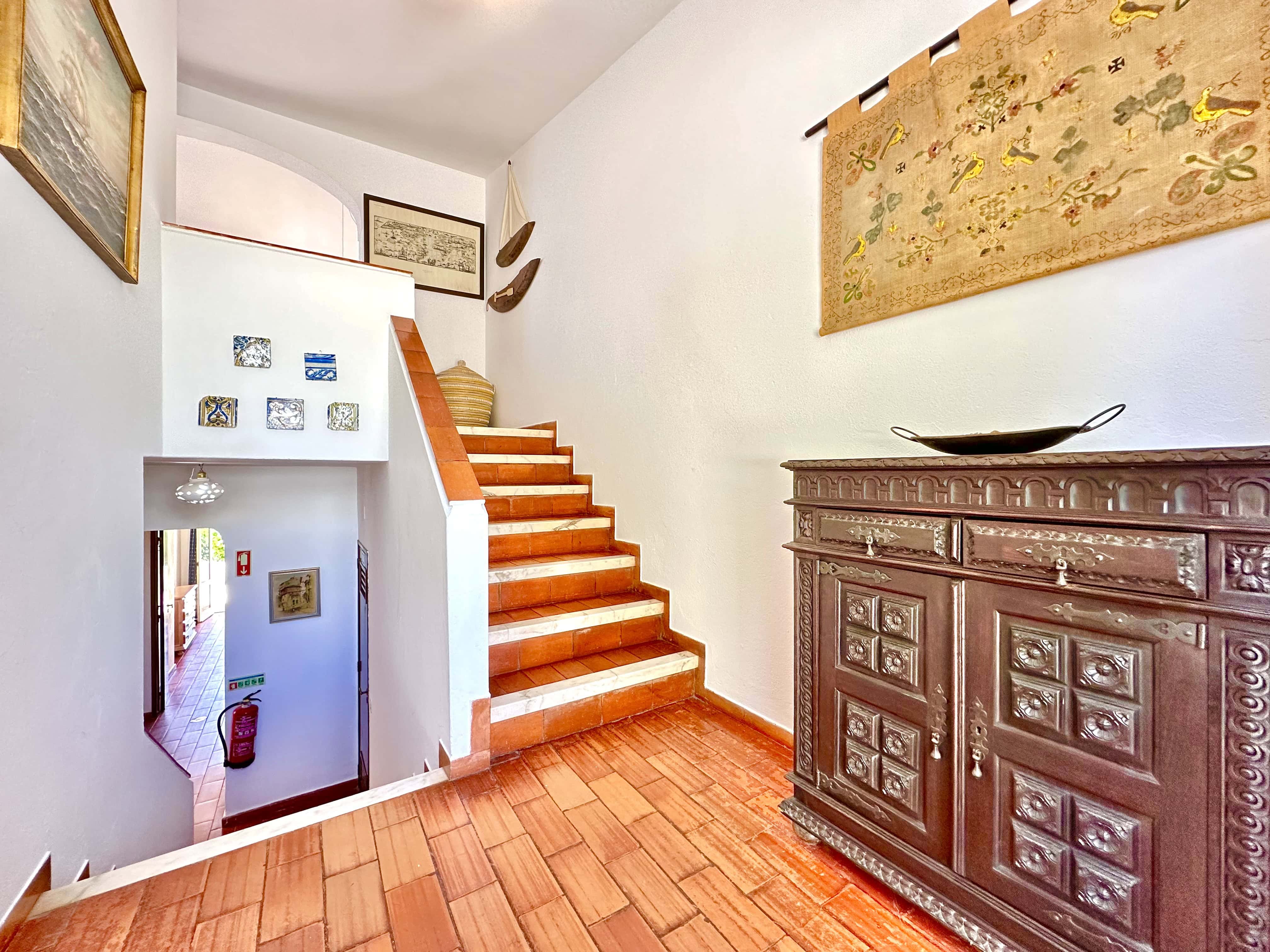 No piso térreo tem 3 quartos, dois são quartos duplos (um dele com ar condicionado) e um tem uma cama de casal, também tem 2 casas de banho com duche. Todos os quartos têm saída para um terraço.