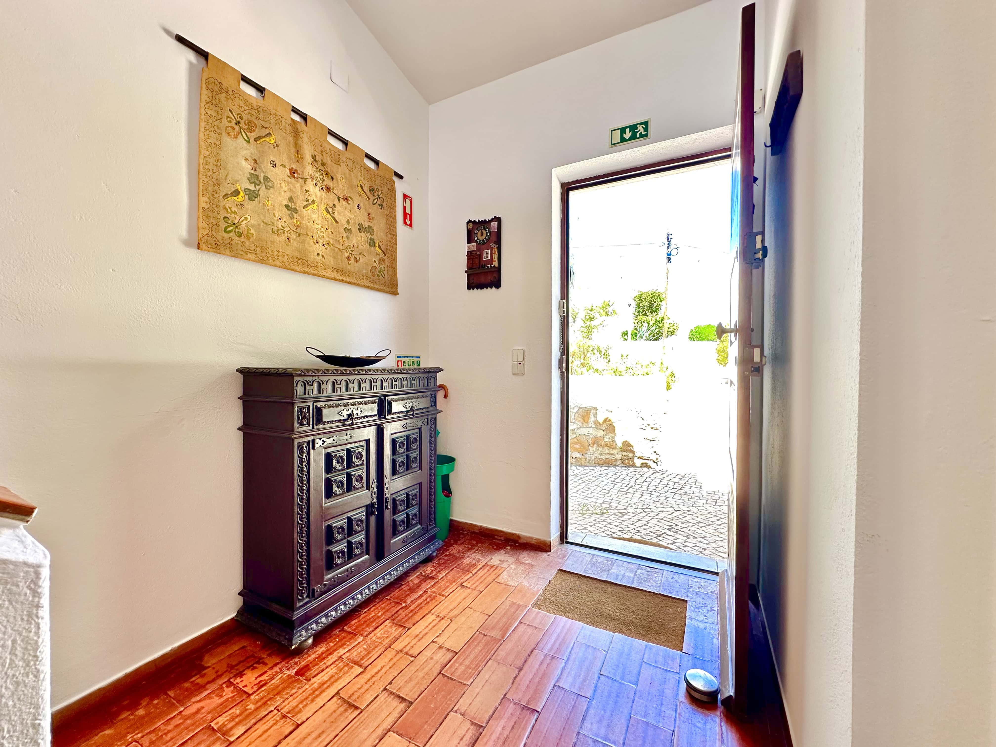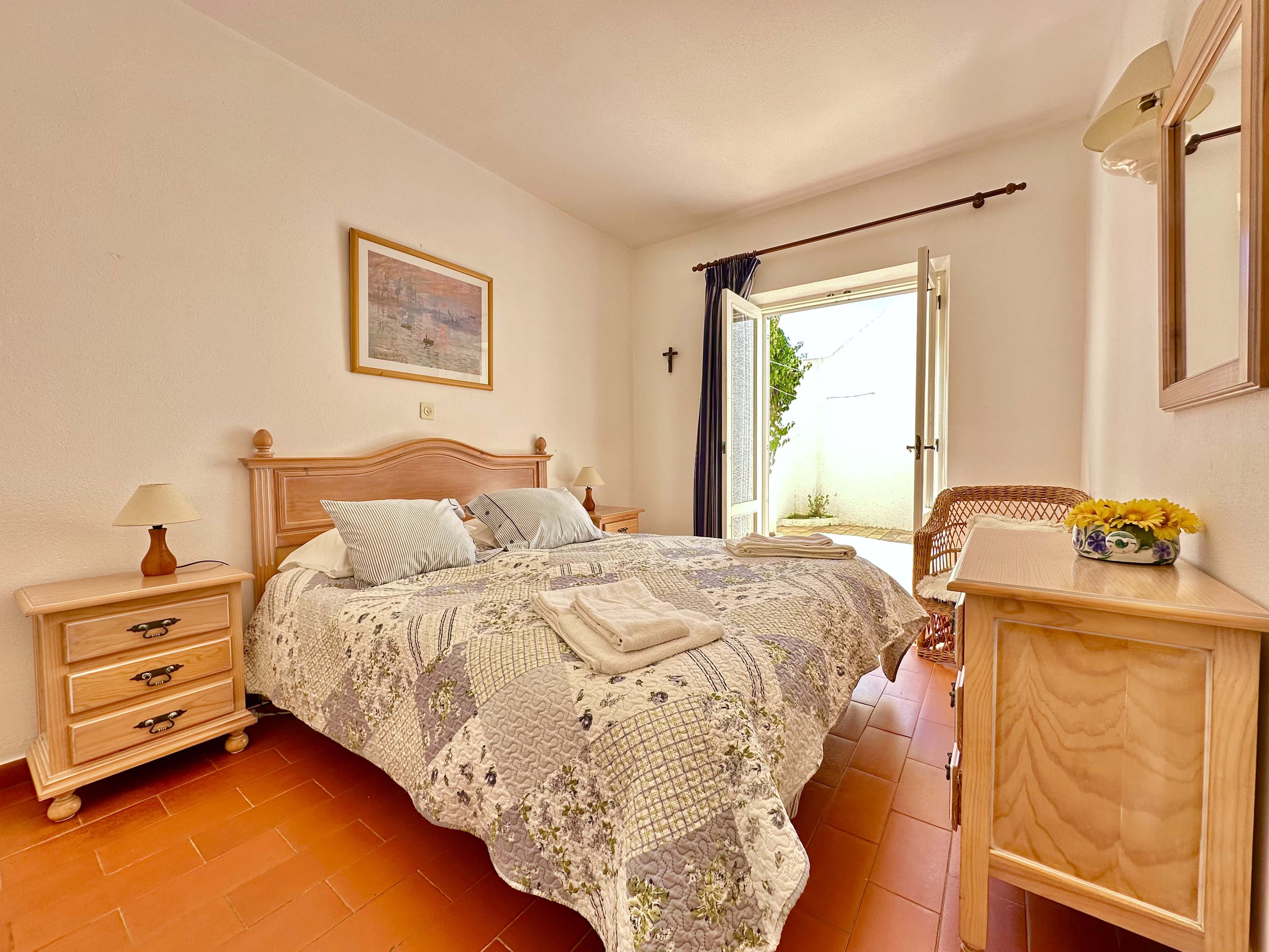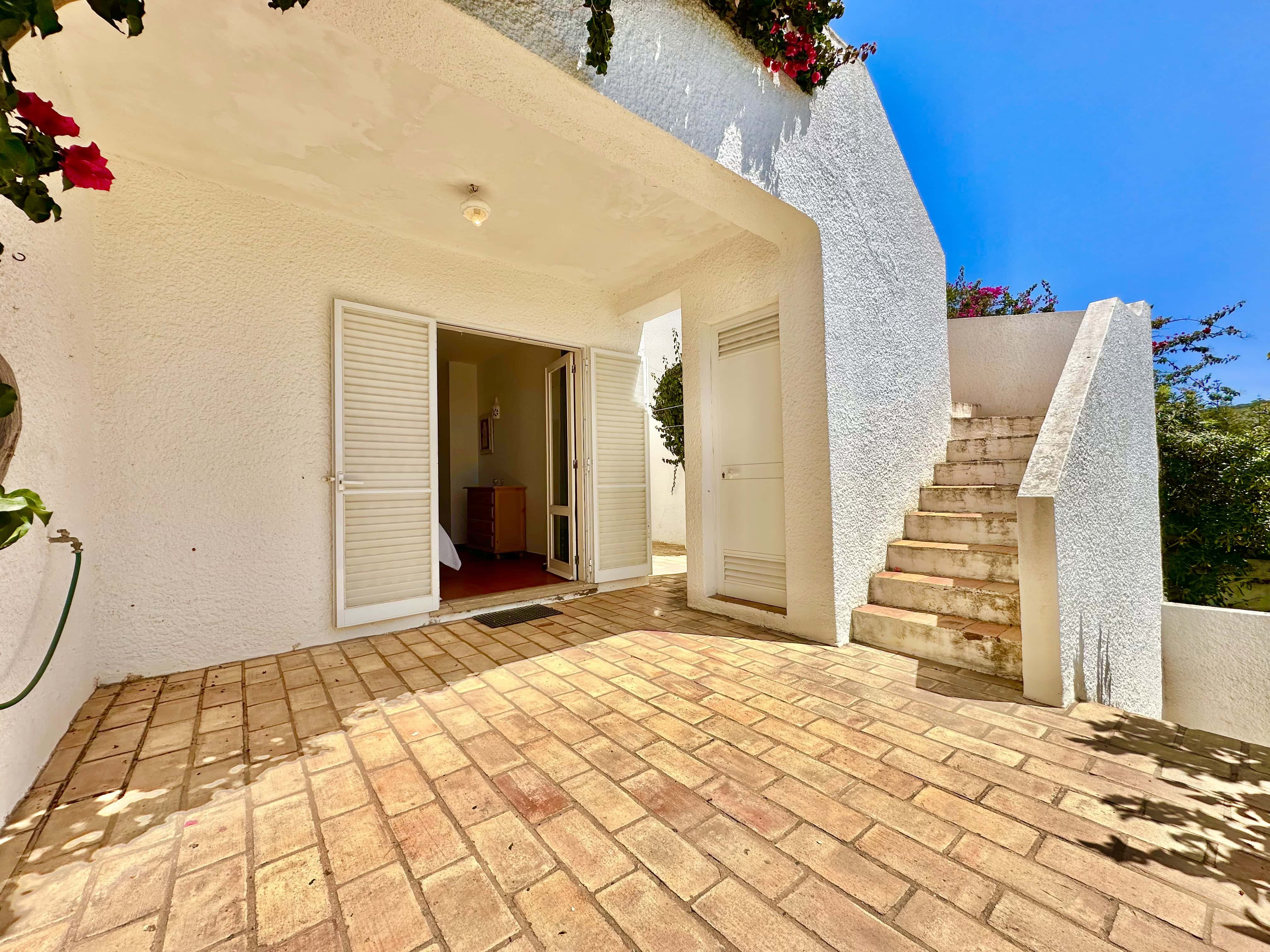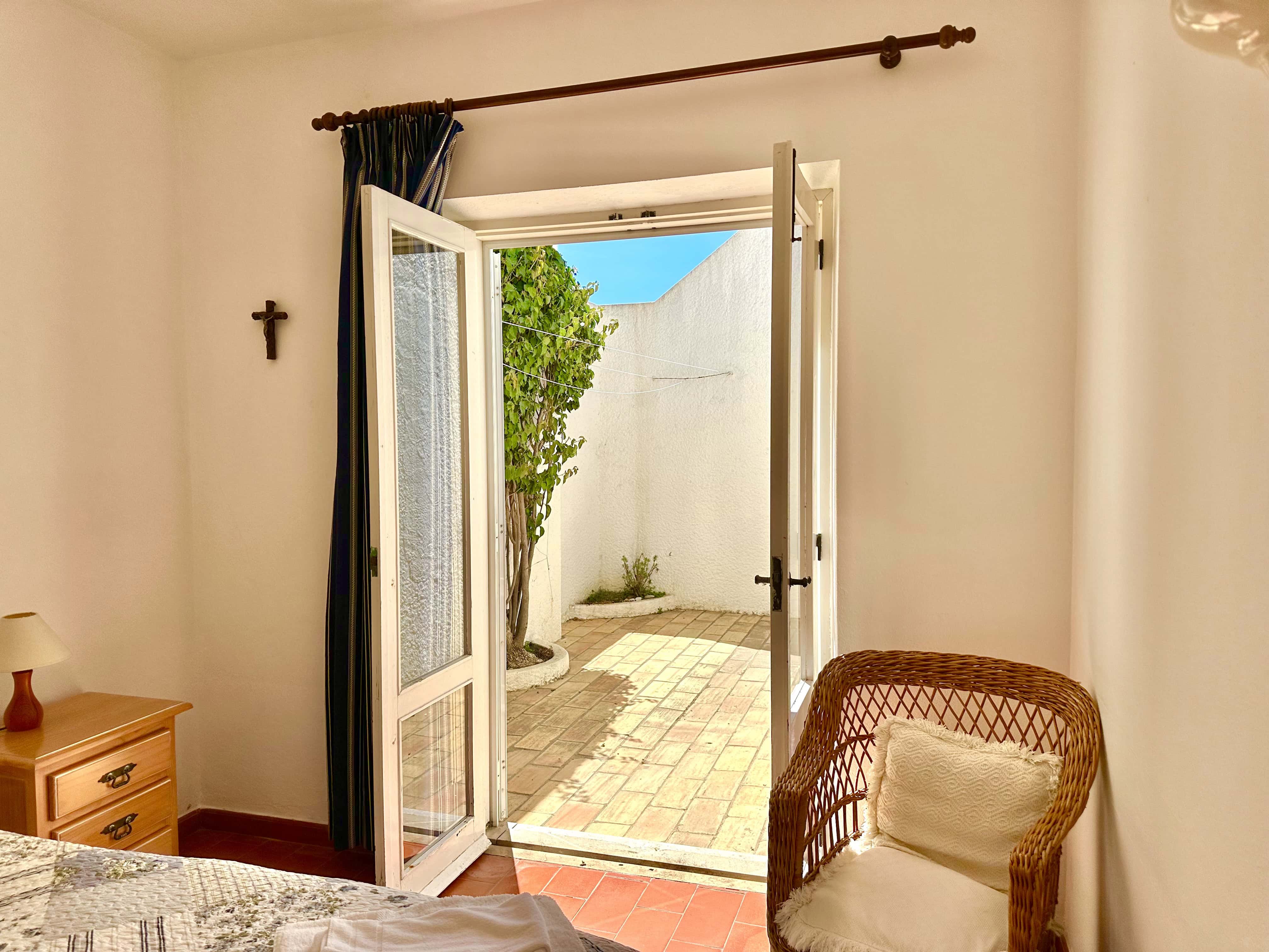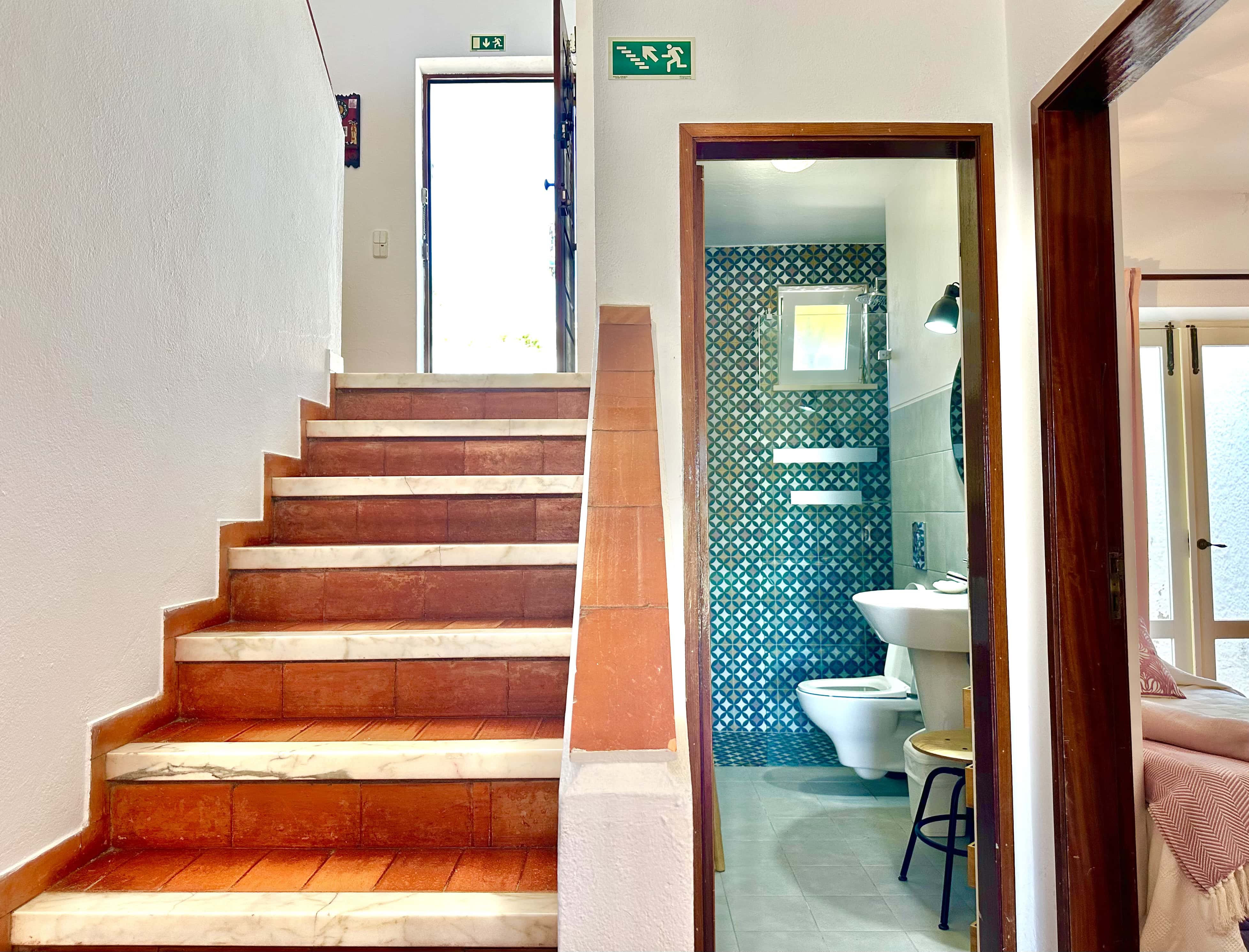 No piso térreo tem 3 quartos, dois são quartos duplos (um dele com ar condicionado) e um tem uma cama de casal, também tem 2 casas de banho com duche. Todos os quartos têm saída para um terraço.