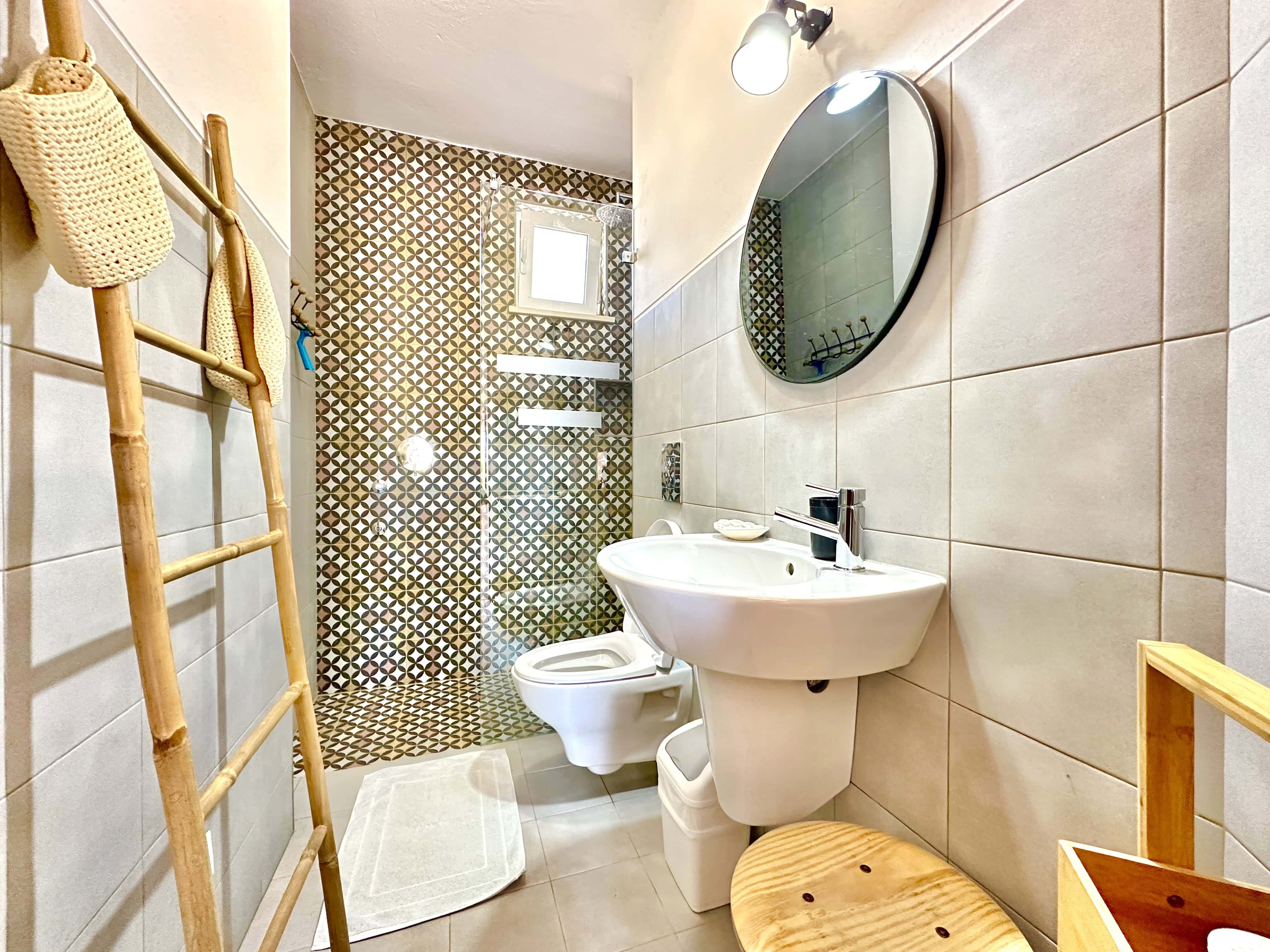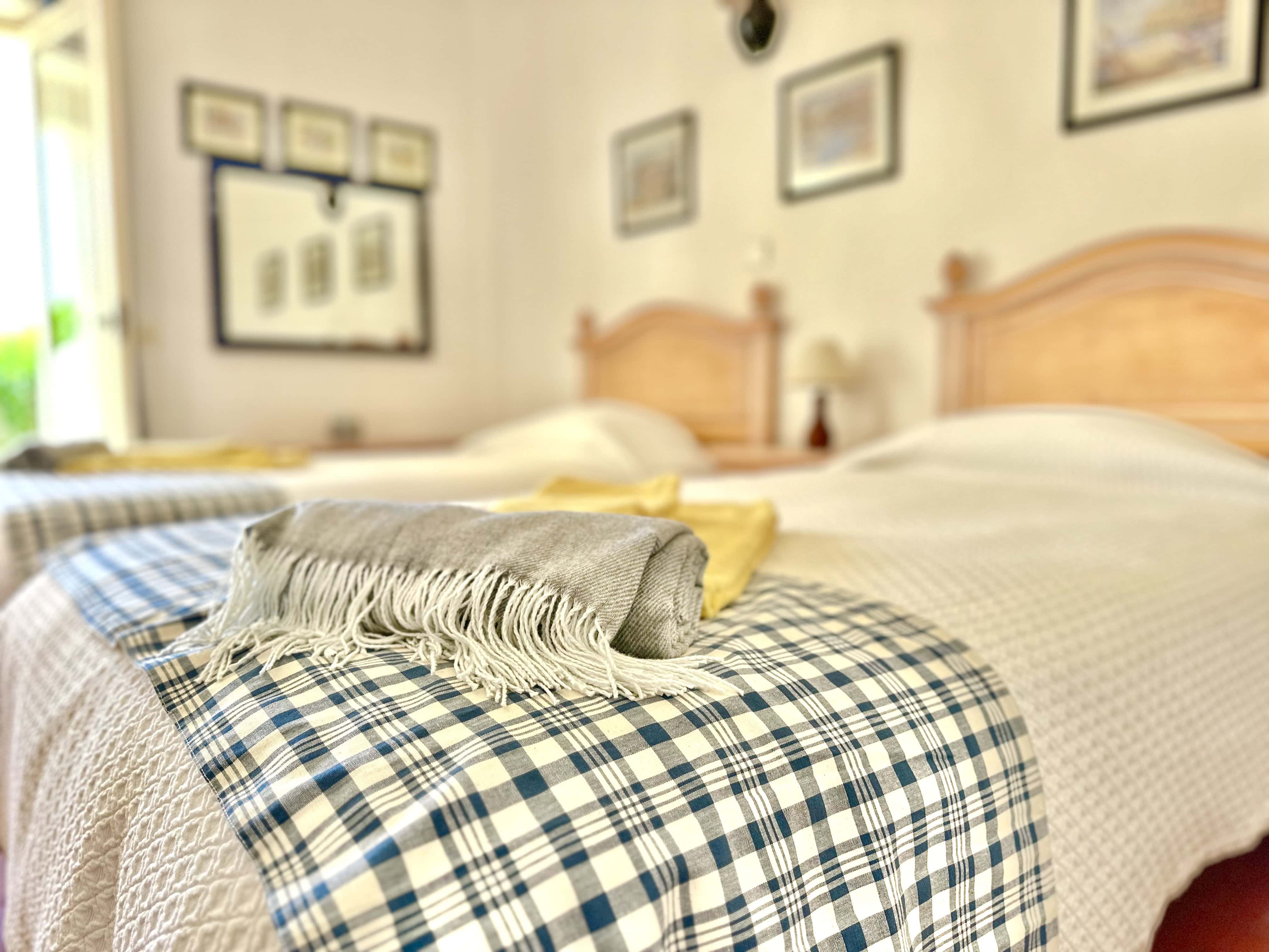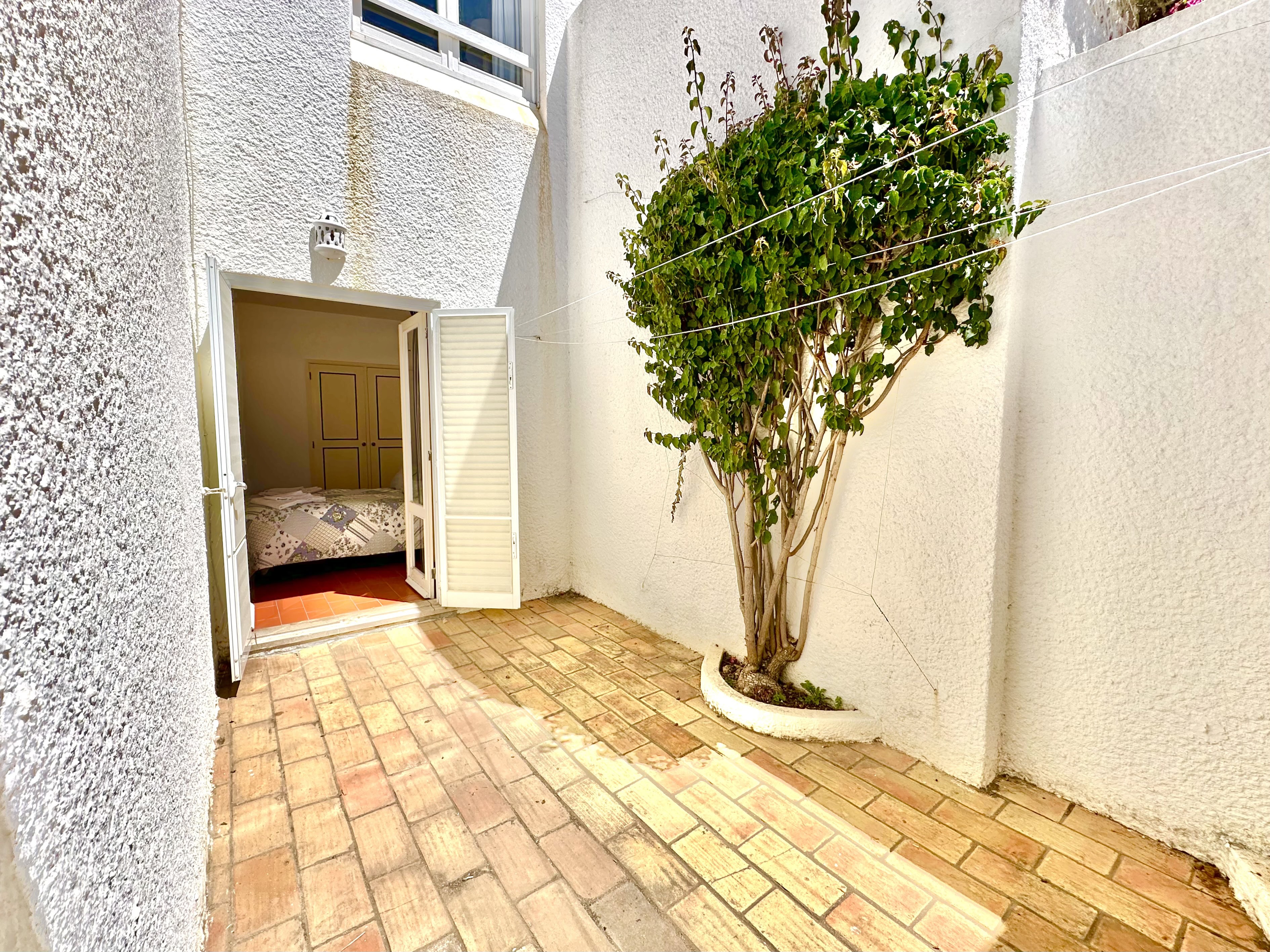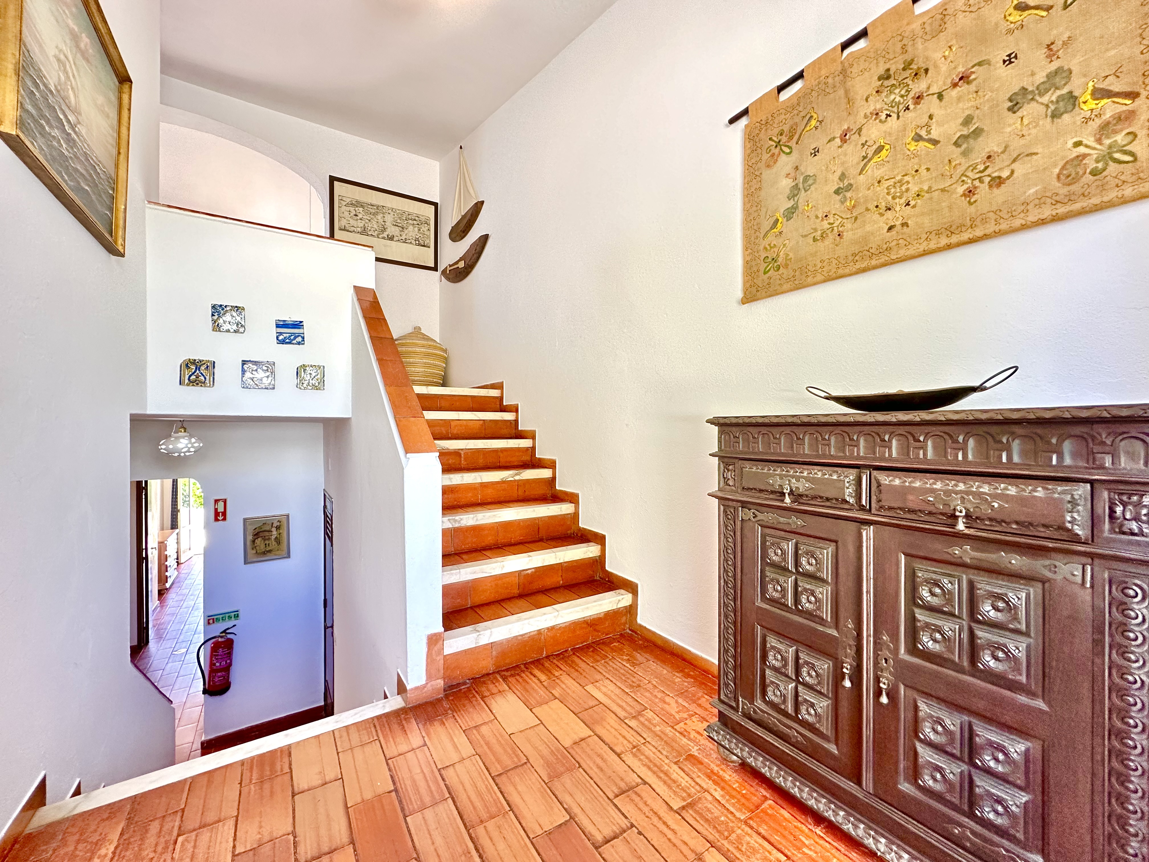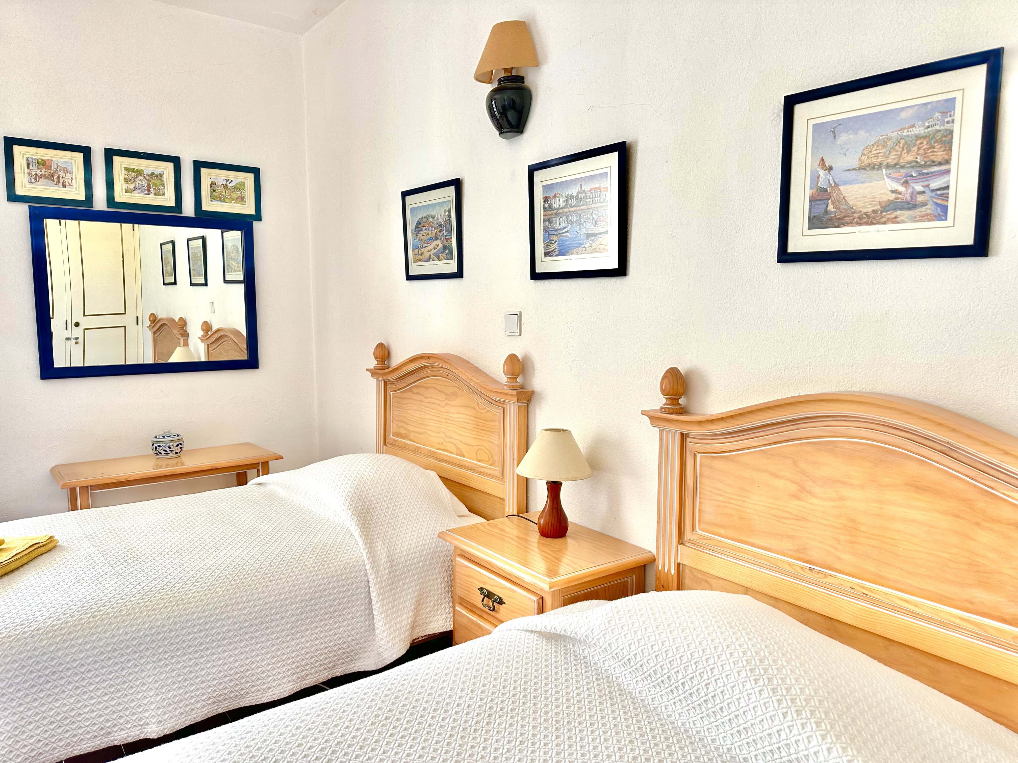 No piso térreo tem 3 quartos, dois são quartos duplos (um dele com ar condicionado) e um tem uma cama de casal, também tem 2 casas de banho com duche. Todos os quartos têm saída para um terraço.