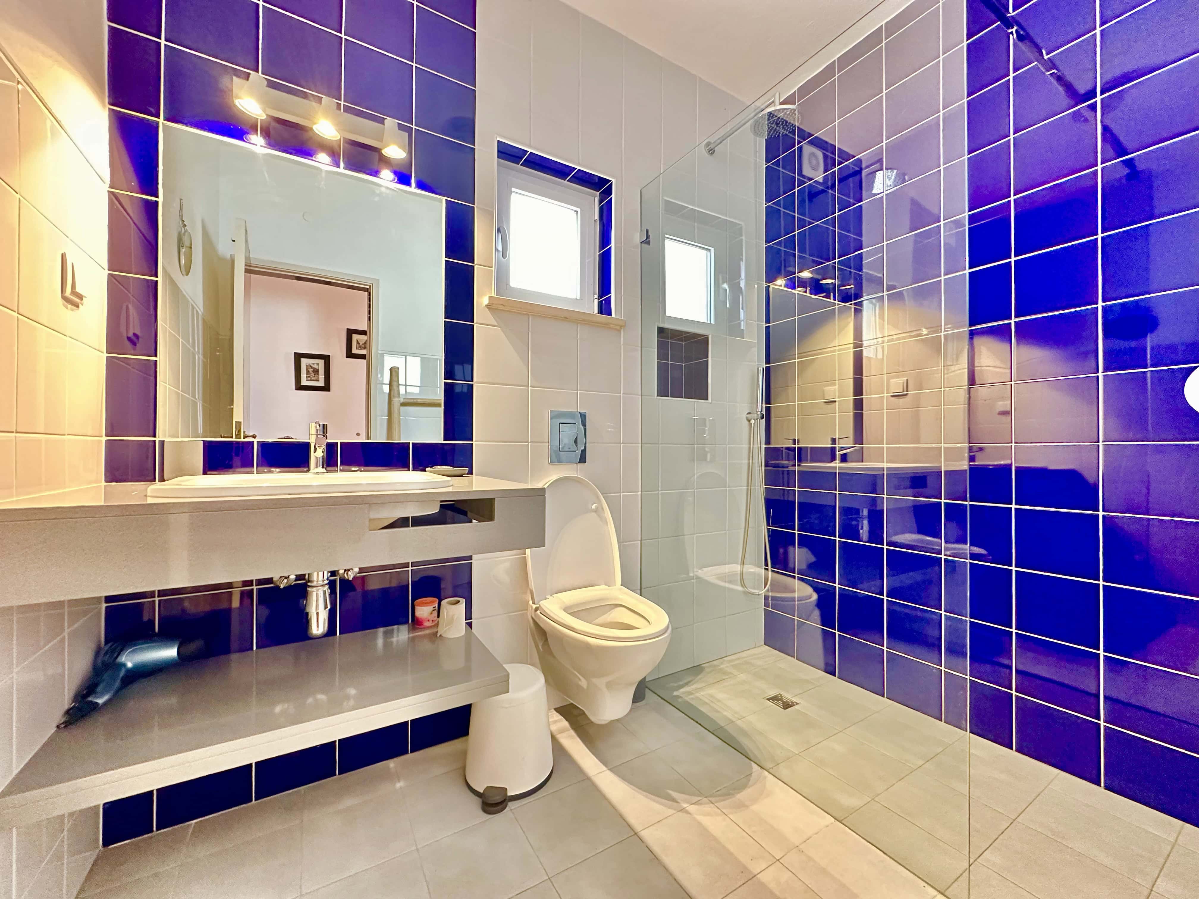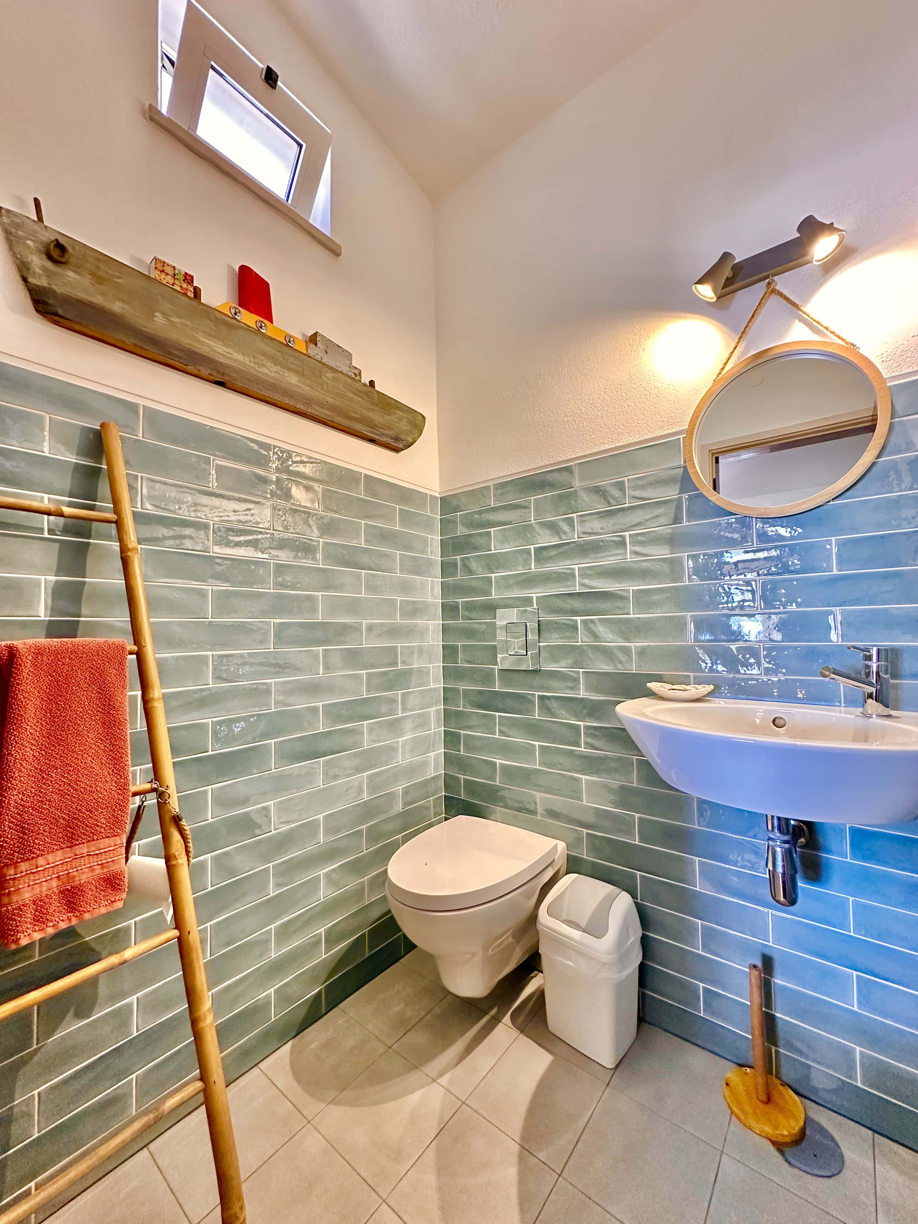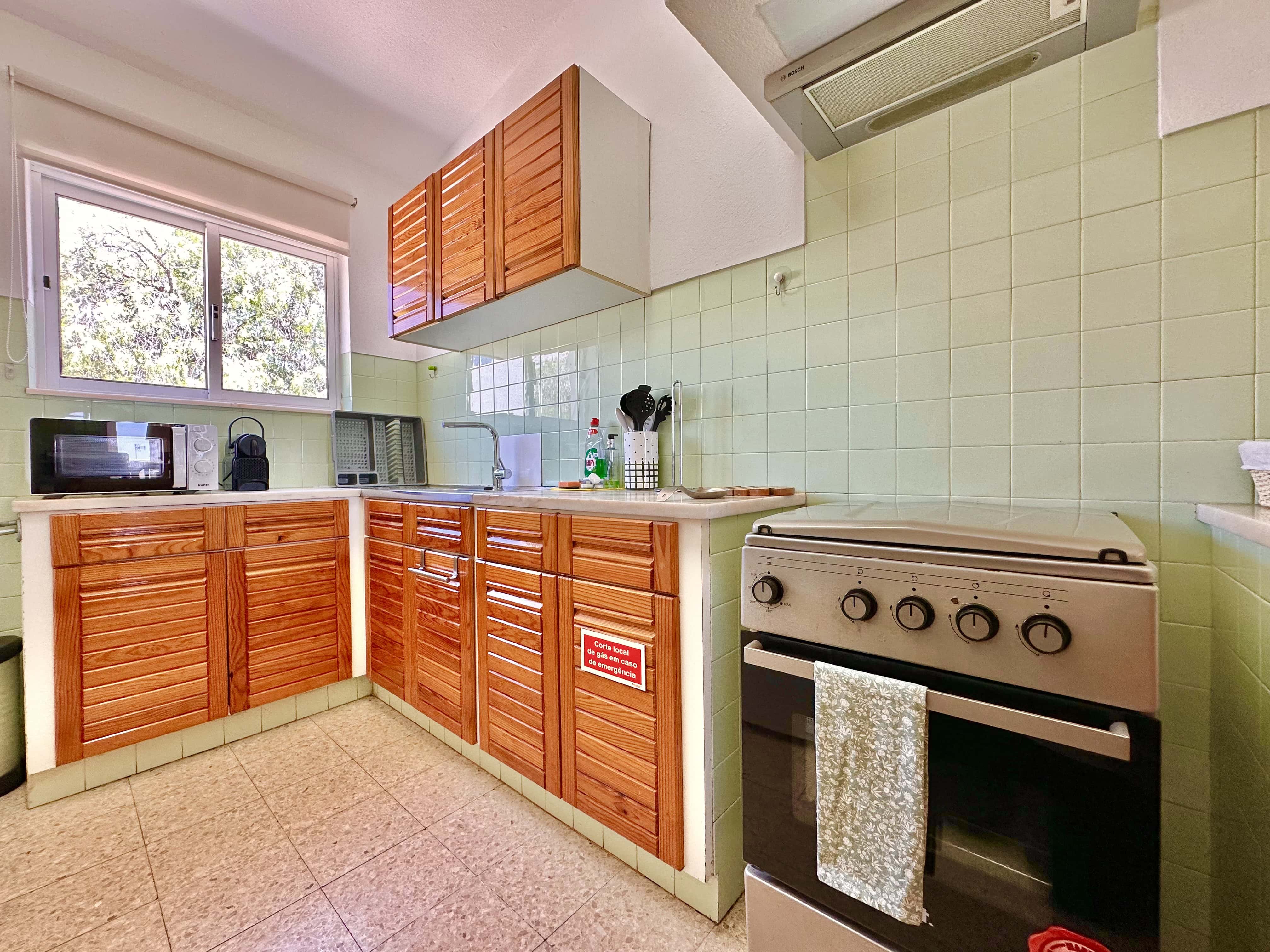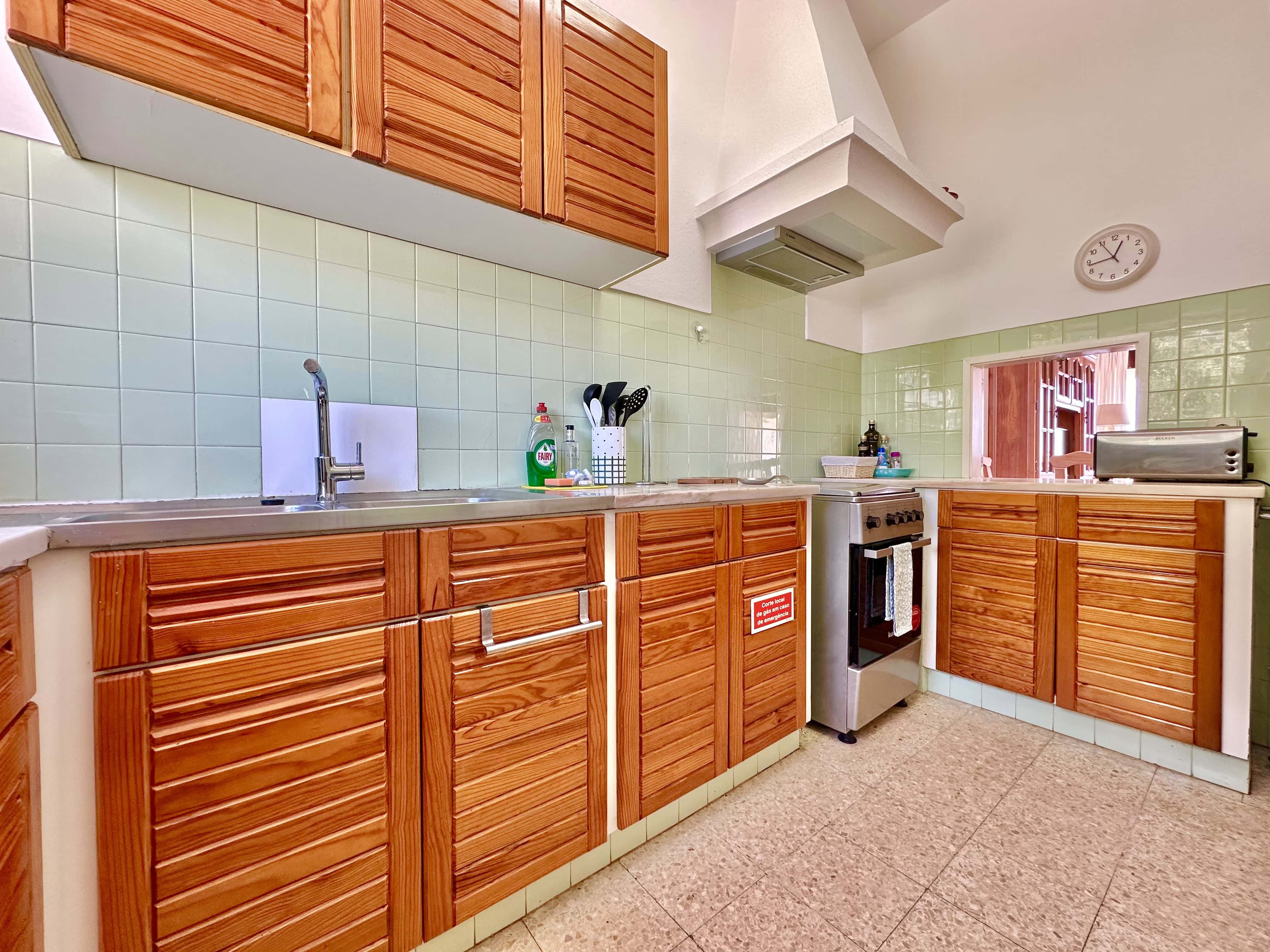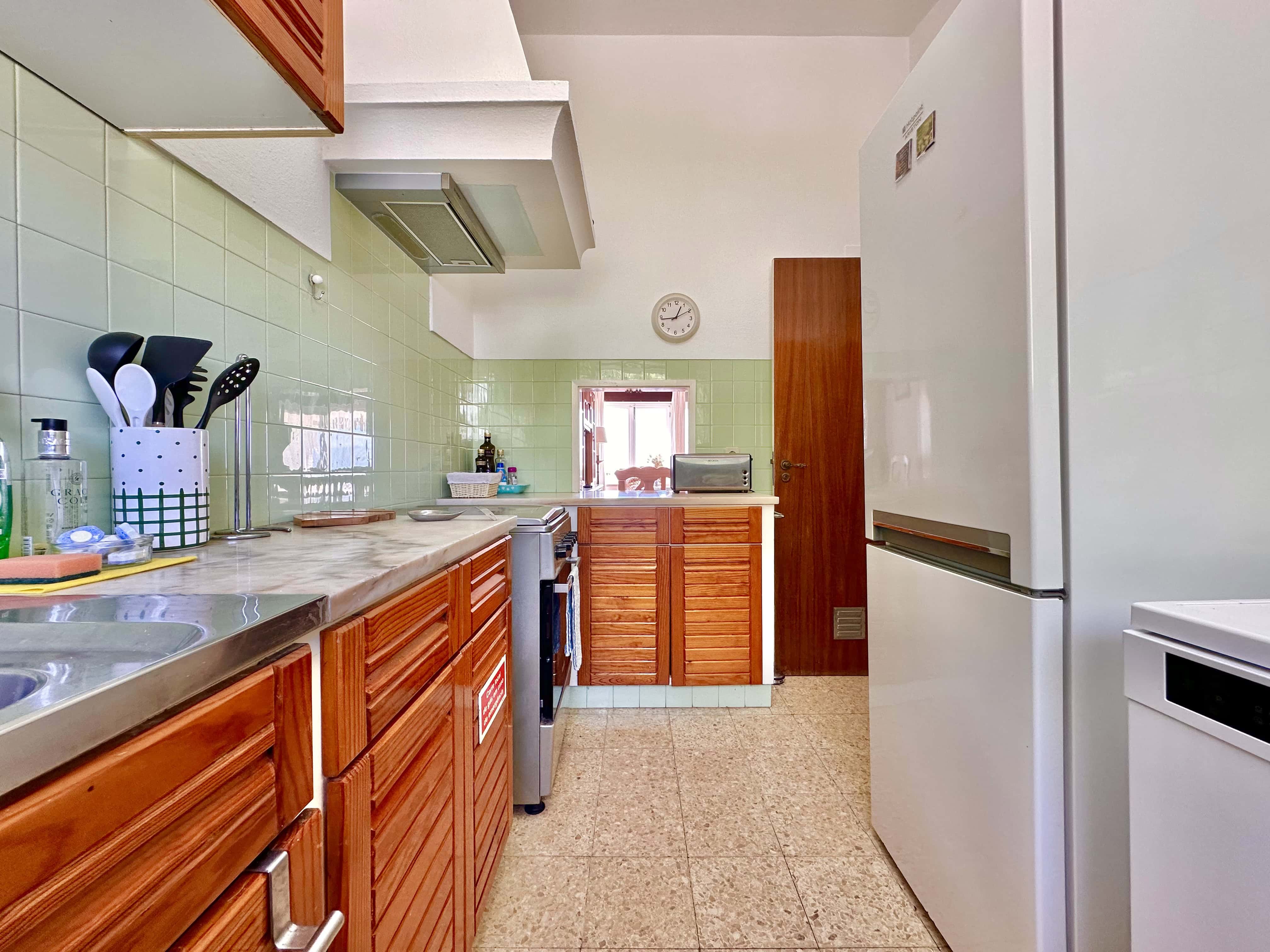 No primeiro andar temos uma boa cozinha totalmente equipada, incluindo microondas, chaleira, forno, frigorífico com congelador, como também máquina de lavar louça e roupa. Também há um pequeno lavabo com sanita.