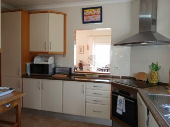 A moderna e bem equipada cozinha encastrada contém microondas, máquina de lavar roupa e louça e os habituais fogão, frigorífico, máquina de café, chaleira, etc.