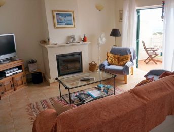 A sala está bem mobilada com TV com Canais por Cabo e Satélite, como também Internet Fibra de Alta Velocidade. A sala tem duas grandes portas de correr que vão dar à grande varanda, com uma mesa e cadeiras para apreciarem a vista da praia, da vila e das falésias.